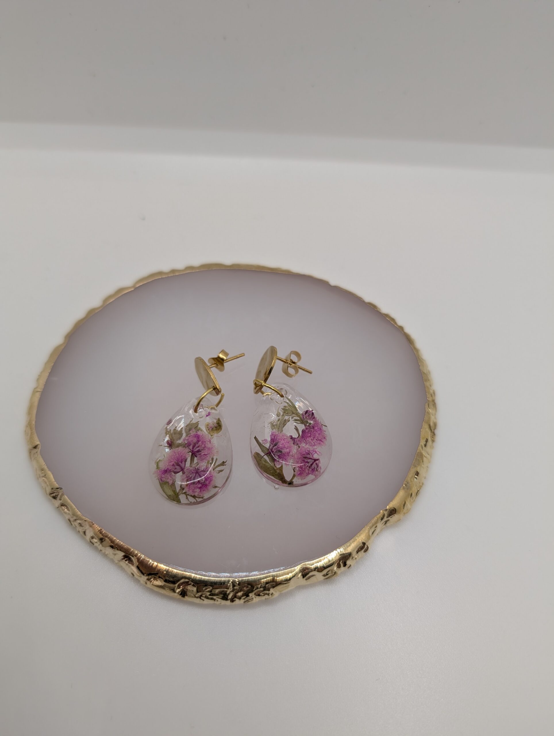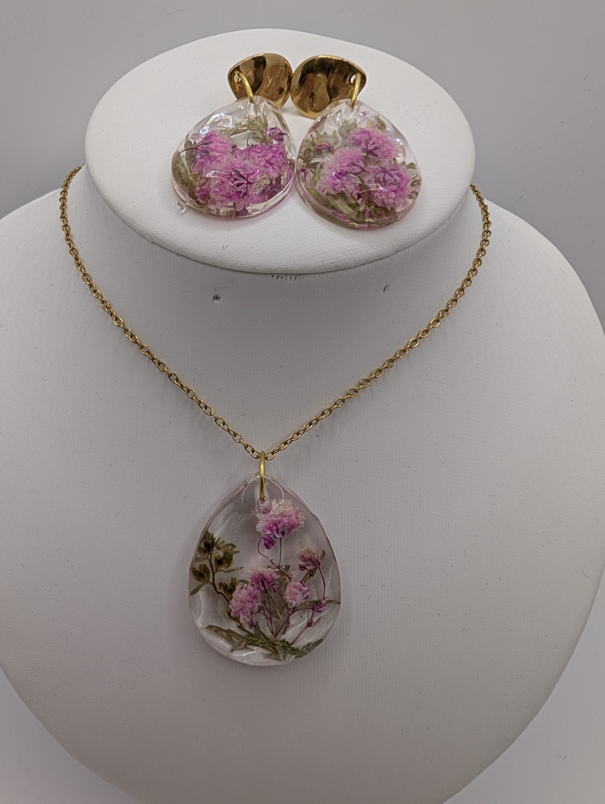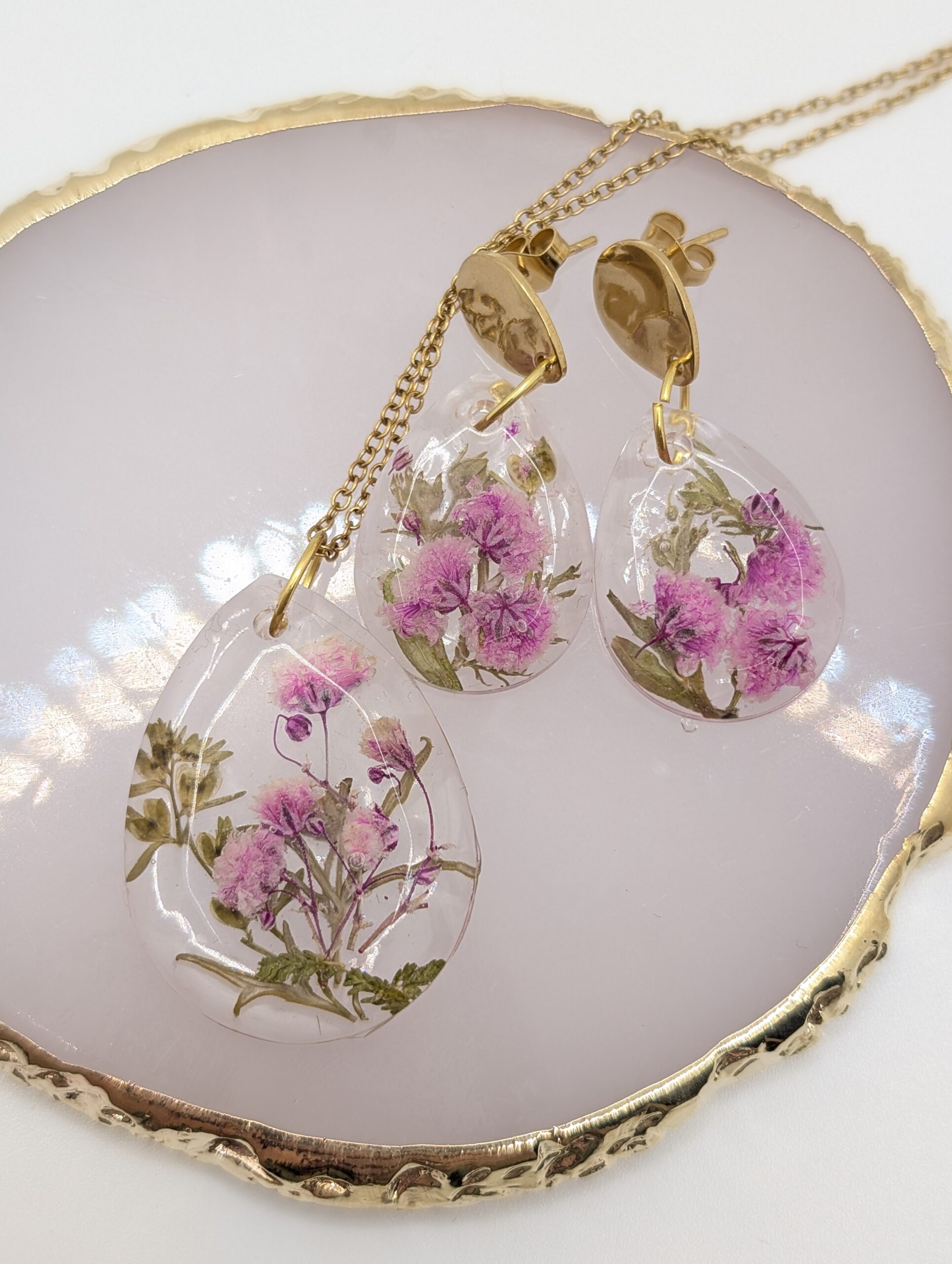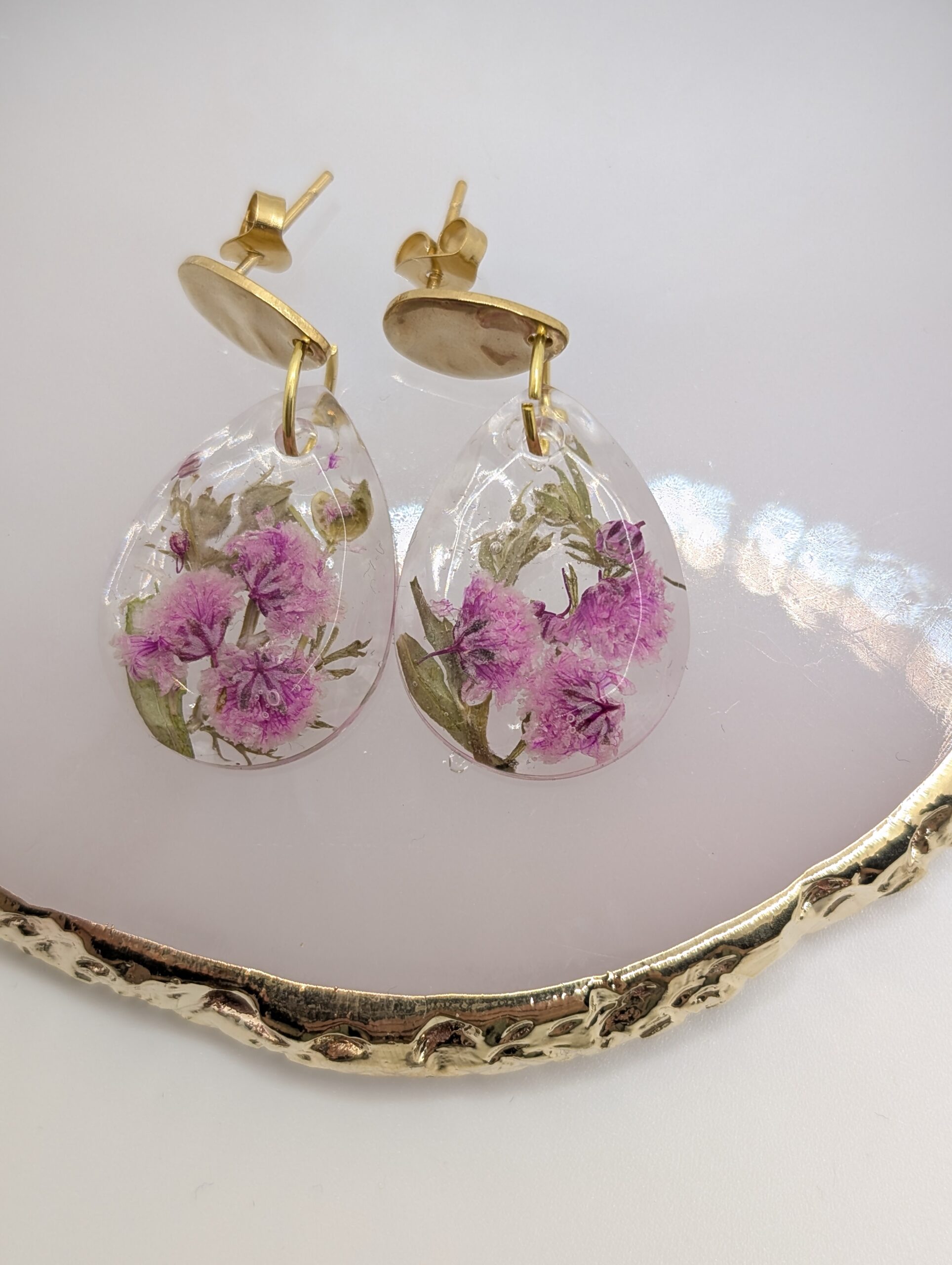 • Materiał: Żywica jubilerska, suszone rośliny, stal szlachetna pozłacana.