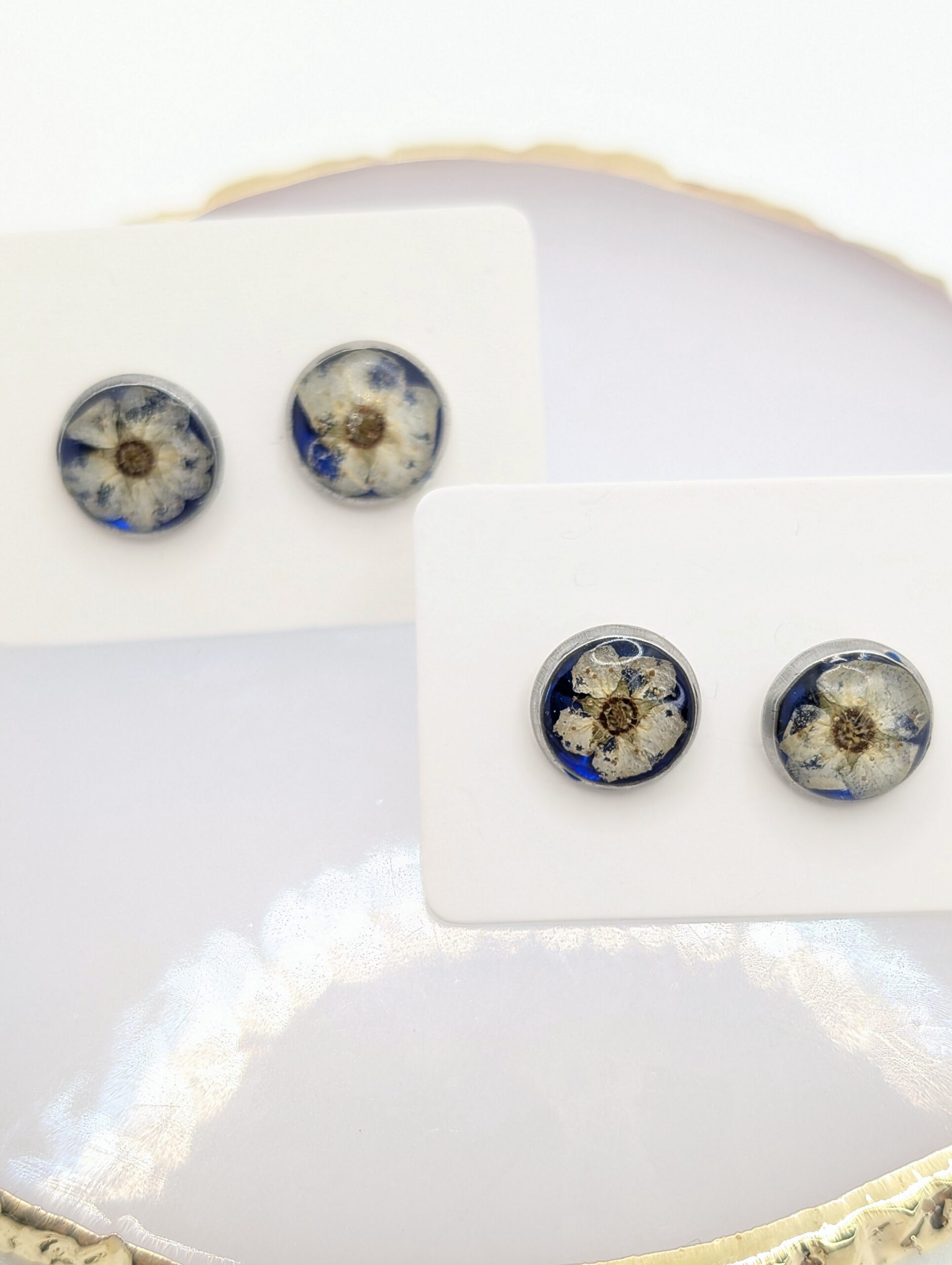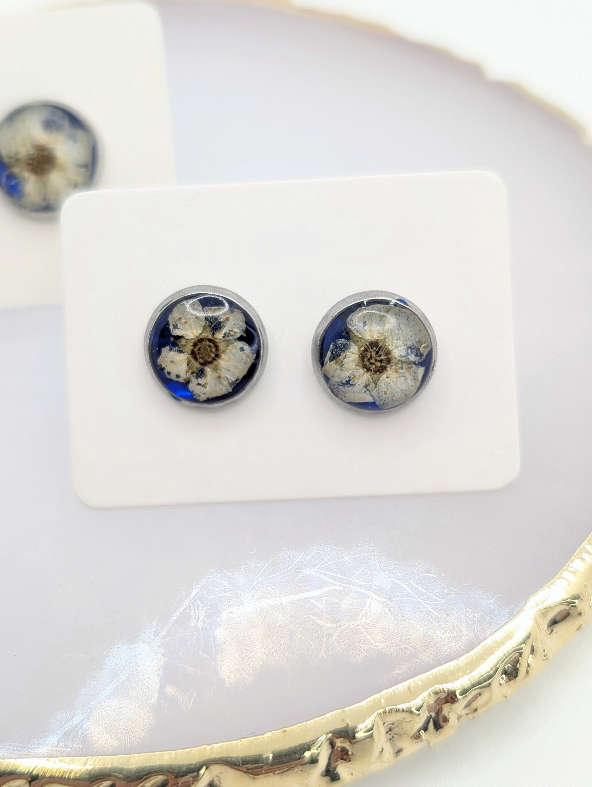 Te ręcznie wykonane kolczyki z kwiatem to małe drobinki natury, które możesz mieć zawsze blisko siebie. Wewnątrz okrągłych opraw zamknęłam delikatną, białą tawułę, której drobne kwiatuszki kontrastują z głębokim, granatowym tłem przywołującym na myśl nocne niebo. Ta kompozycja zatrzymała urok słonecznej łąki w bardzo eleganckiej formie. Ponieważ tawuła symbolizuje wdzięk i subtelną radość, biżuteria ta emanuje spokojem oraz nostalgicznym pięknem. Srebrzyste wykończenie stalowych opraw otula rośliny ukryte pod gładką taflą, co nadaje im wyjątkowej głębi. W rezultacie otrzymujesz dodatek, który nie tylko zdobi, ale też wywołuje uśmiech przy każdym spojrzeniu w lustro.