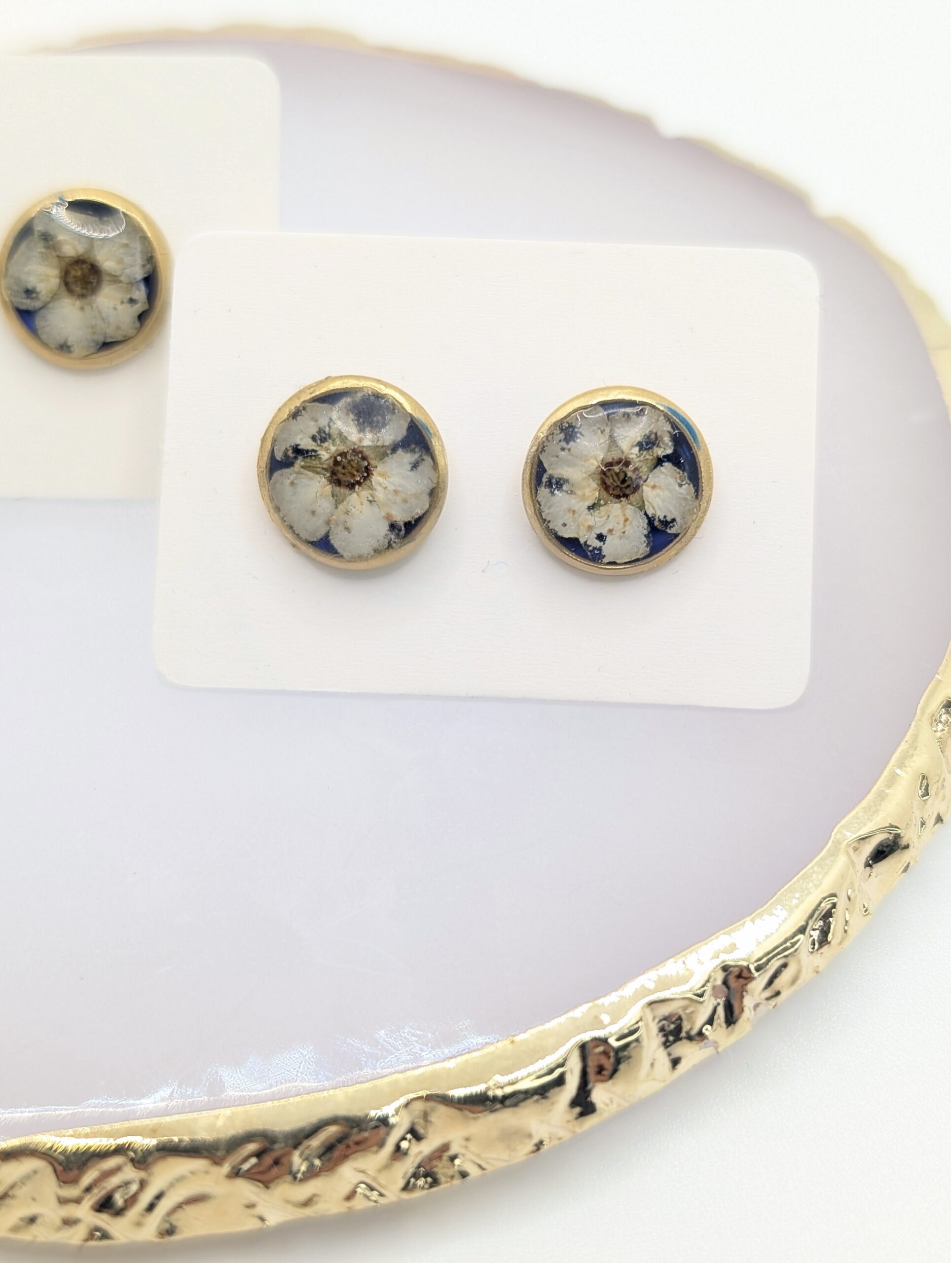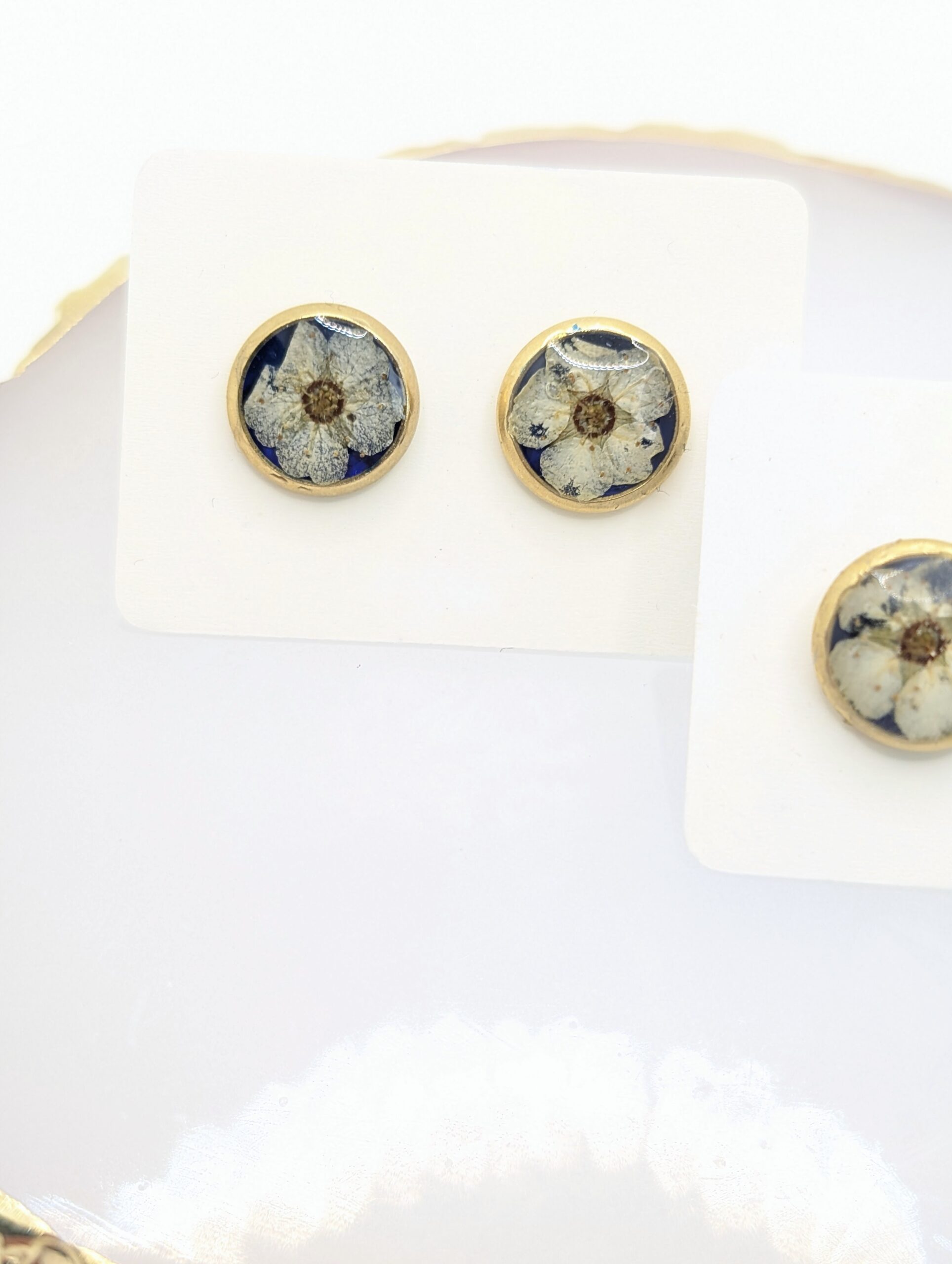 Te ręcznie wykonane kolczyki z kwiatem to małe drobinki natury, które możesz mieć zawsze blisko siebie. Wewnątrz okrągłych, złocistych opraw zamknęłam delikatną białą tawułę, której drobne kwiatuszki kontrastują z głębokim, granatowym tłem przywołującym na myśl nocne niebo. Ta kompozycja zatrzymała urok słonecznej łąki w bardzo eleganckiej formie. Ponieważ tawuła symbolizuje wdzięk i subtelną radość, biżuteria ta emanuje spokojem oraz nostalgicznym pięknem. Złociste wykończenie opraw otula rośliny ukryte pod gładką taflą, co nadaje im wyjątkowej głębi i blasku. W rezultacie otrzymujesz dodatek, który nie tylko pięknie zdobi, ale też wywołuje uśmiech przy każdym spojrzeniu w lustro.