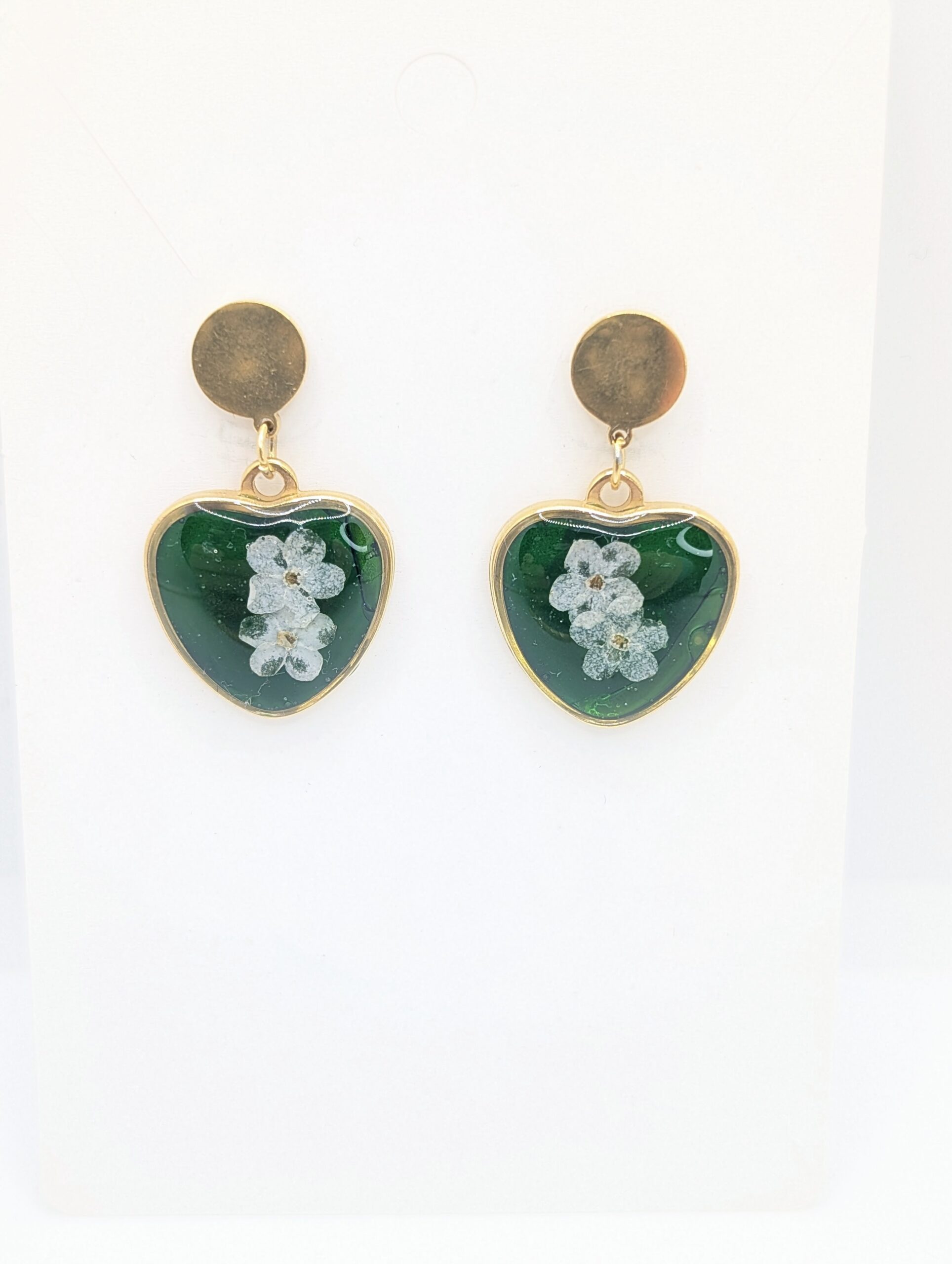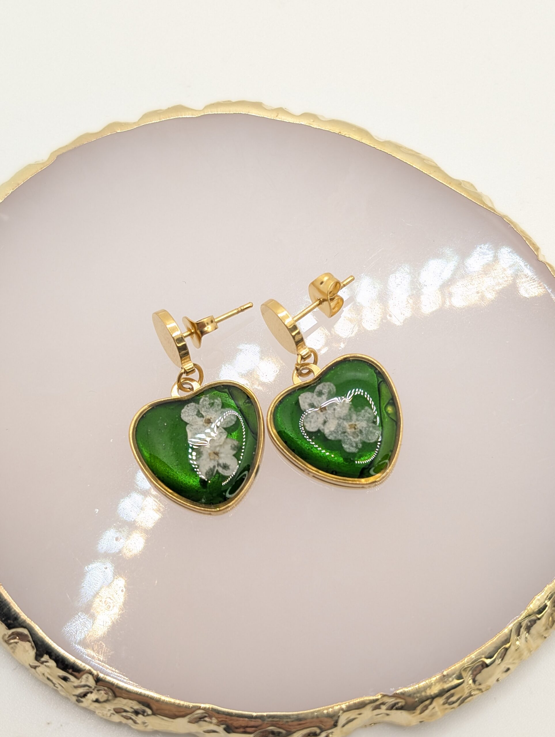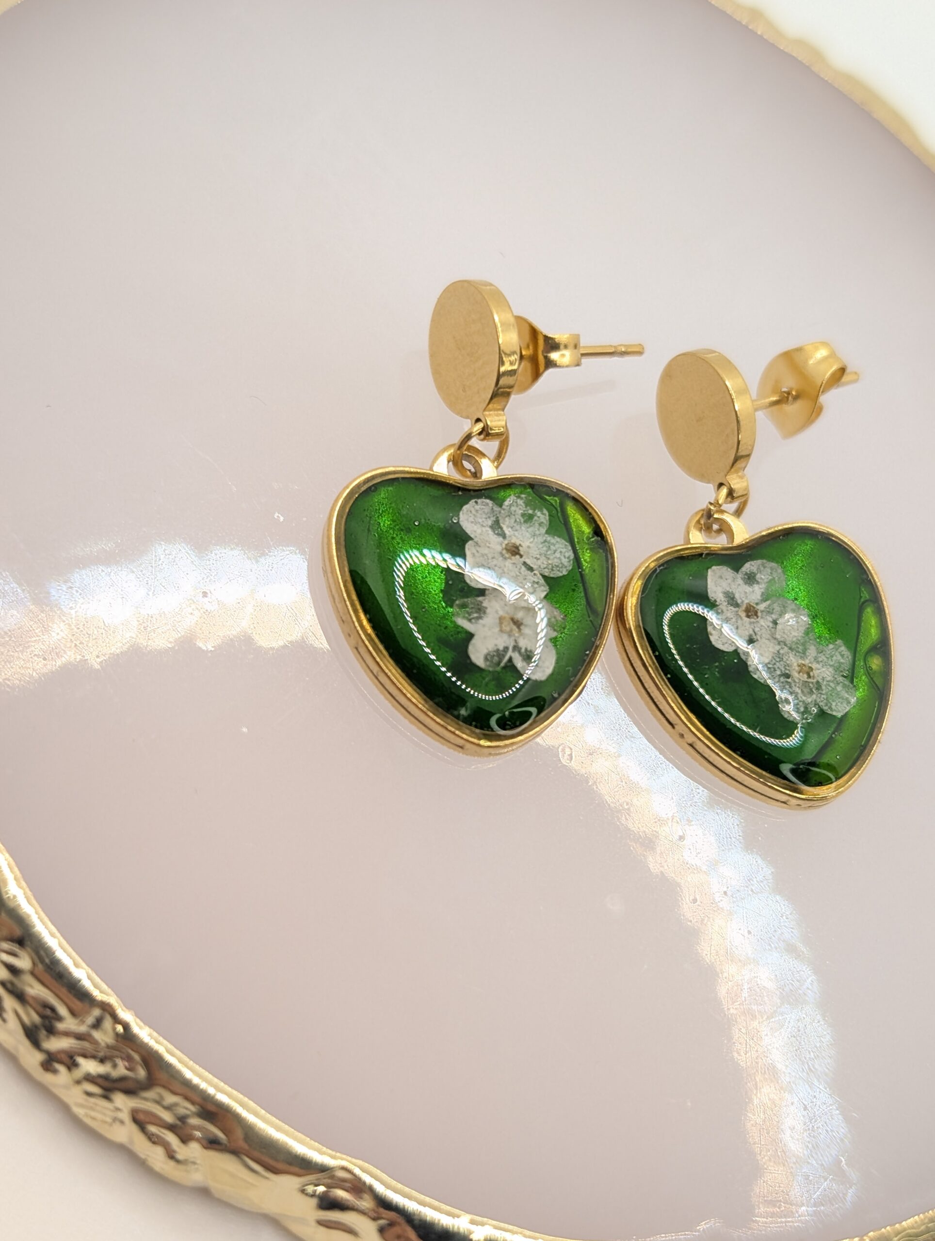 Te ręcznie wykonane kolczyki z kwiatem przyciągają wzrok niezwykłym kontrastem i głębią kolorów. Wewnątrz złotych opraw w kształcie serc umieściłam białe kwiaty niezapominajki, które idealnie odcinają się od intensywnie zielonego tła. Ponieważ zależało mi na wyrazistym efekcie, tło zostało nasycone nasyconym odcieniem szlachetnego szmaragdu. Całość wykończyłam krystaliczną żywicą, która nadaje biżuterii piękny połysk i trwale chroni delikatną kompozycję roślinną. Dzięki zastosowaniu bigli typu sztyft ze stali szlachetnej, kolczyki są bezpieczne dla skóry oraz bardzo komfortowe w noszeniu. W rezultacie otrzymujesz dodatek, który ożywi każdą stylizację.