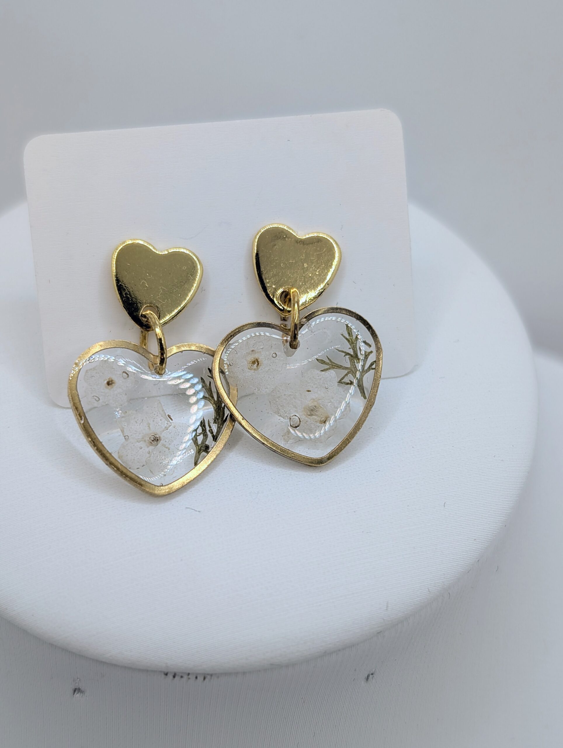 Te ręcznie wykonane kolczyki z żywicy to kwintesencja delikatności oraz kobiecego stylu. Wewnątrz złotych opraw w kształcie serc zamknęłam drobne, białe kwiaty, które zachowują swój naturalny urok na zawsze. Ponieważ kompozycja jest minimalistyczna, biżuteria ta emanuje lekkością oraz wyjątkową elegancją. Złote wykończenie przepięknie kontrastuje z jasnymi płatkami roślin ukrytymi pod lśniącą taflą. W rezultacie otrzymujesz dodatek, który subtelnie rozświetla twarz i dodaje uroku każdej stylizacji.