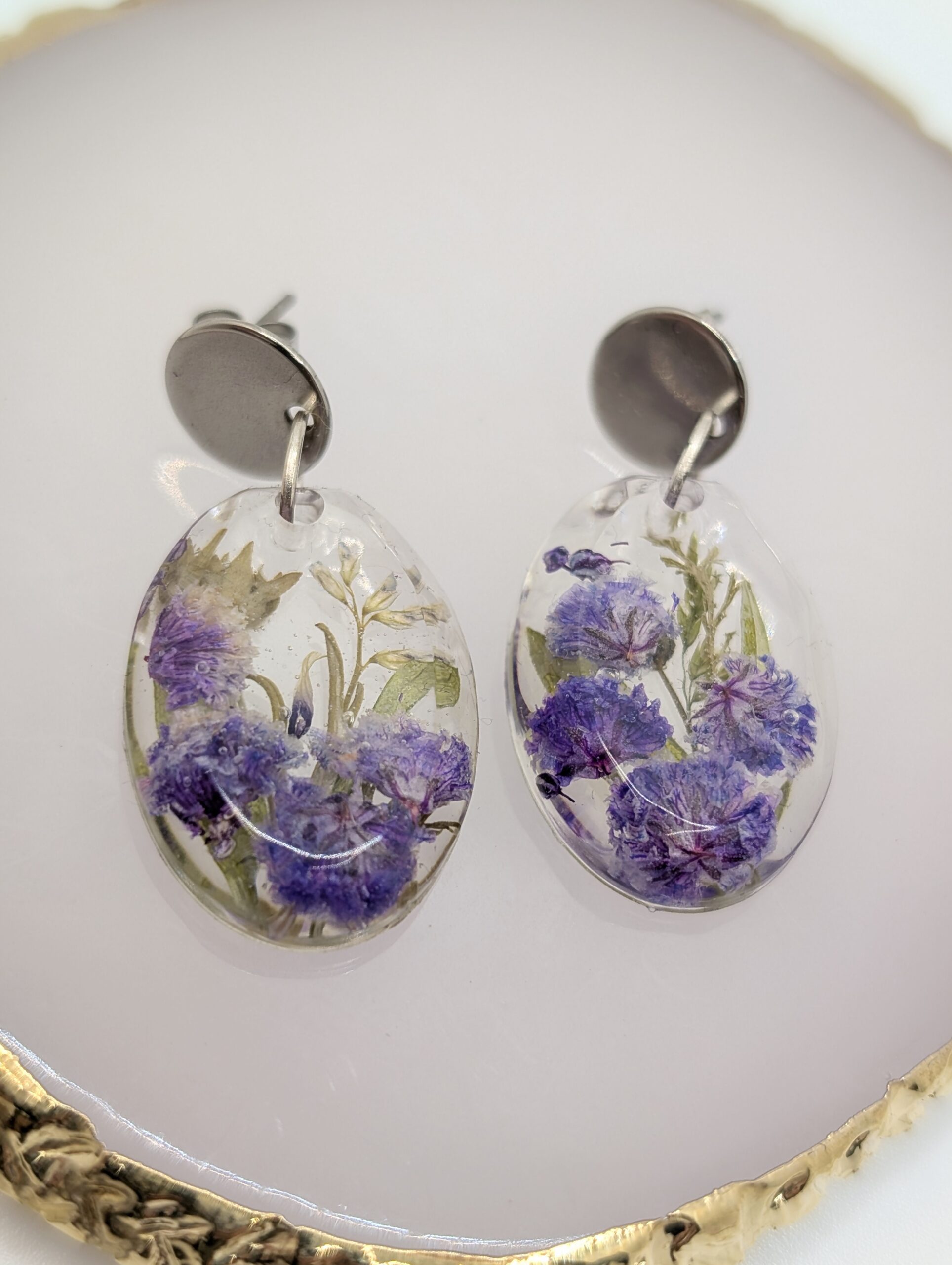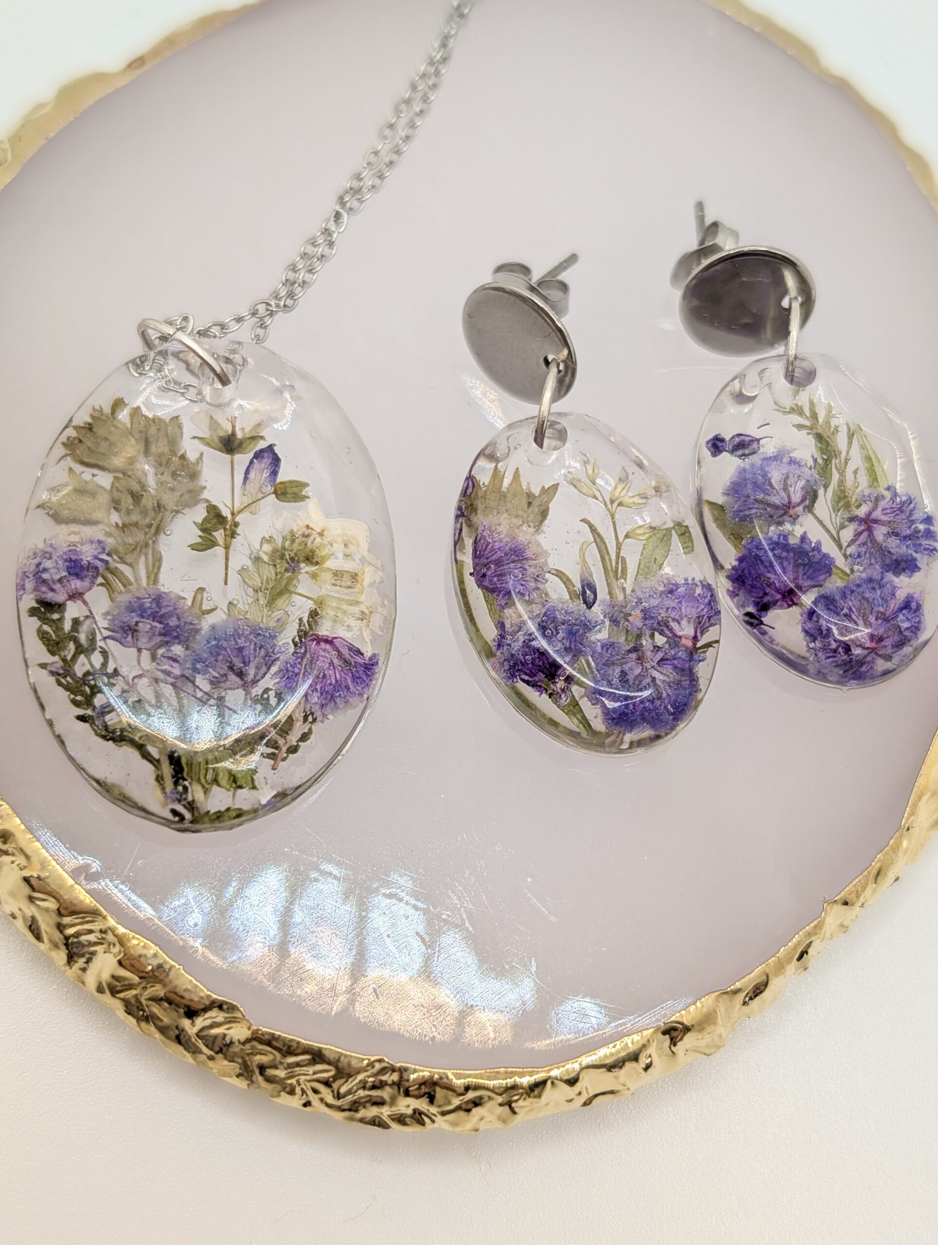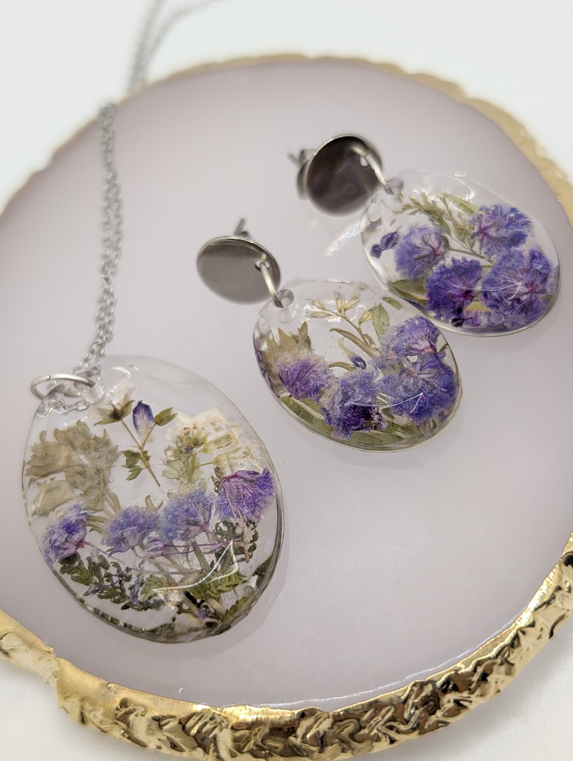 Materiał: żywica jubilerska, suszone rośliny, stal szlachetna.