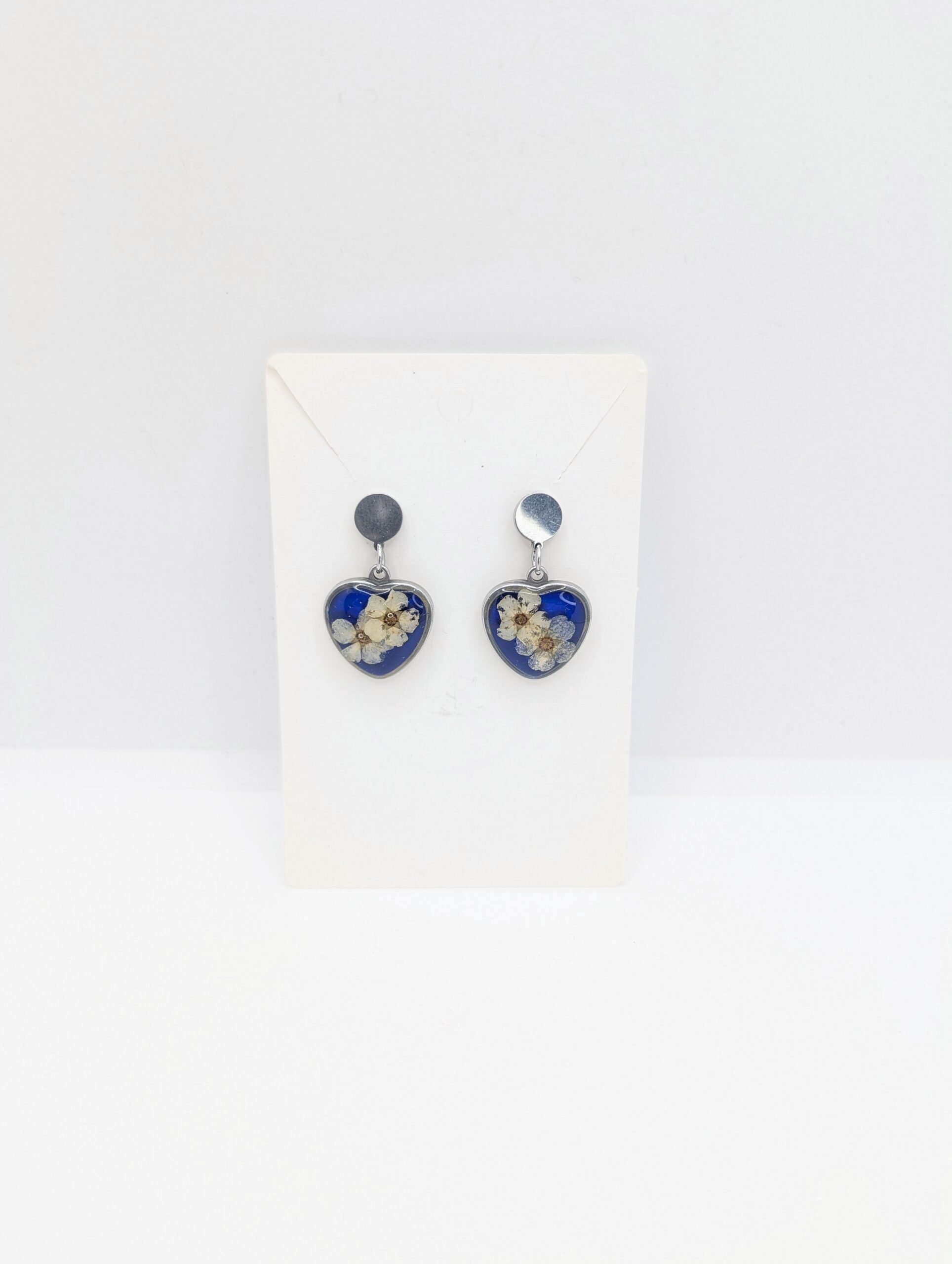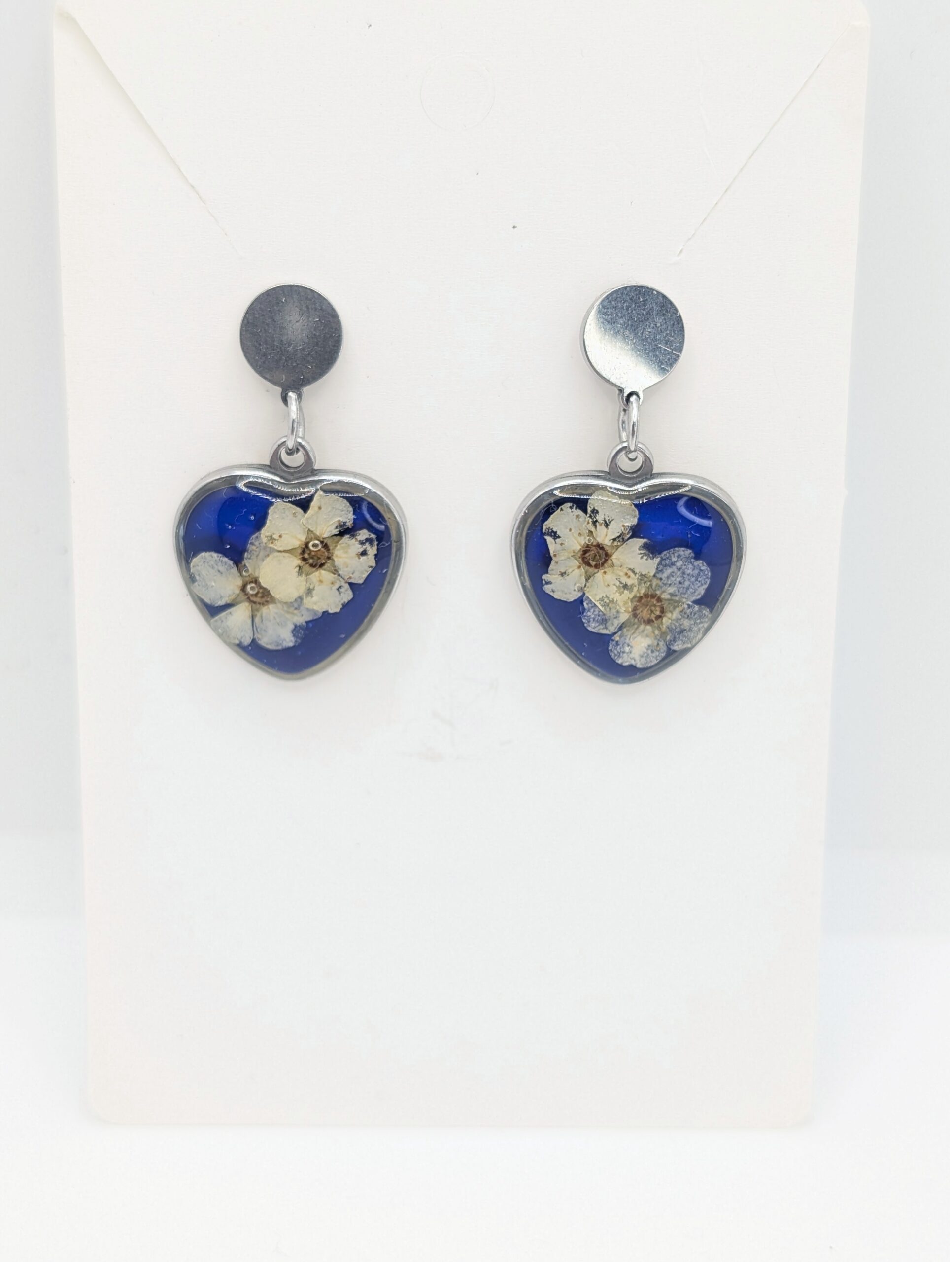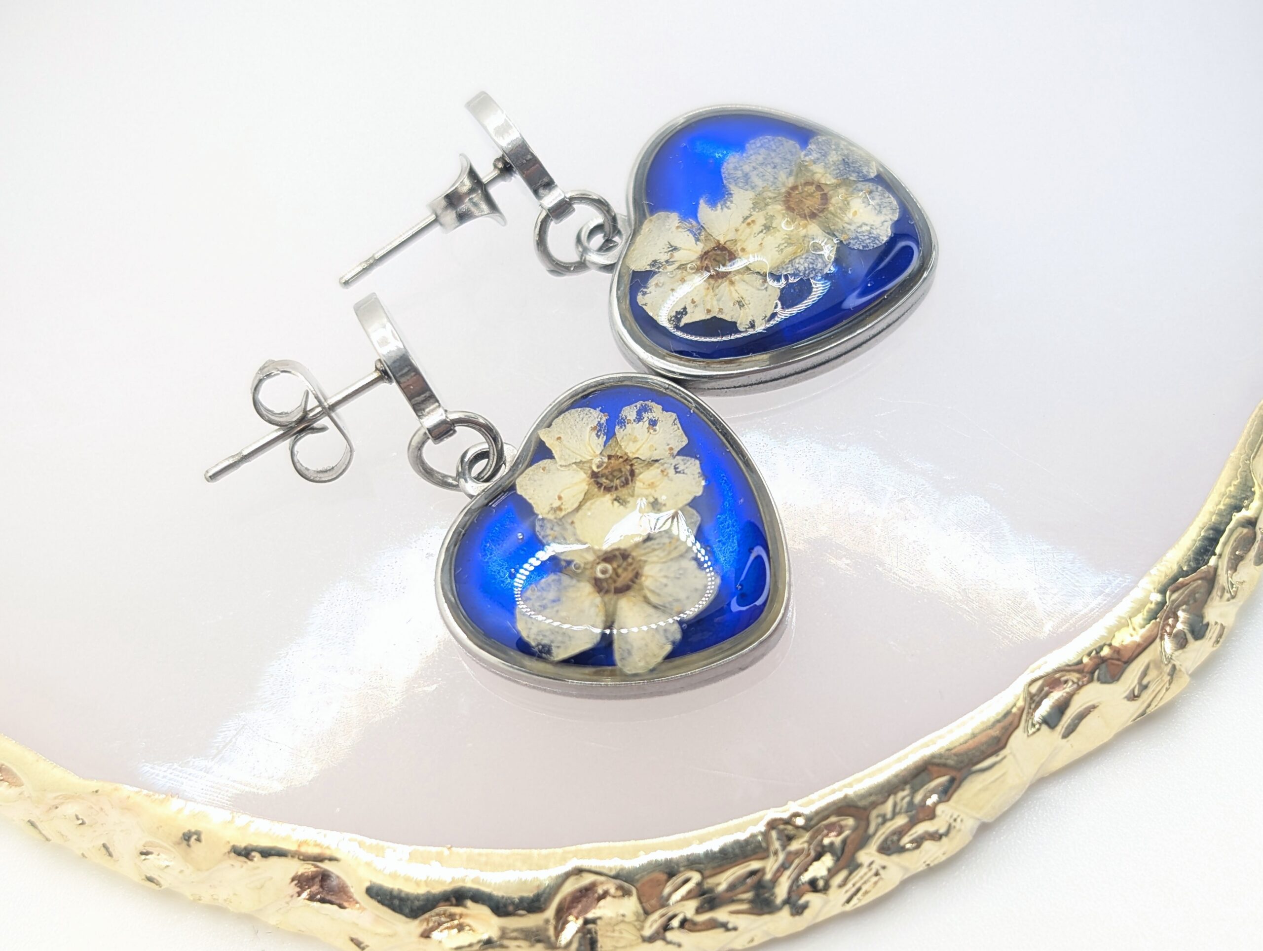 Te ręcznie wykonane kolczyki z żywicy przyciągają wzrok niezwykłym kontrastem i głębią kolorów. Wewnątrz srebrnych opraw w kształcie serc umieściłam białe kwiaty tawuły, które idealnie odcinają się od intensywnie niebieskiego tła. Ponieważ zależało mi na wyrazistym efekcie, tło zostało nasycone kolorem przypominającym bezchmurne niebo. Całość wykończyłam krystaliczną powłoką, która nadaje biżuterii piękny połysk i chroni rośliny przed upływem czasu. Dzięki zastosowaniu srebrnych sztyftów ze stali szlachetnej, kolczyki są bezpieczne dla skóry oraz bardzo komfortowe w noszeniu. W rezultacie otrzymujesz dodatek, który ożywi każdą stylizację.