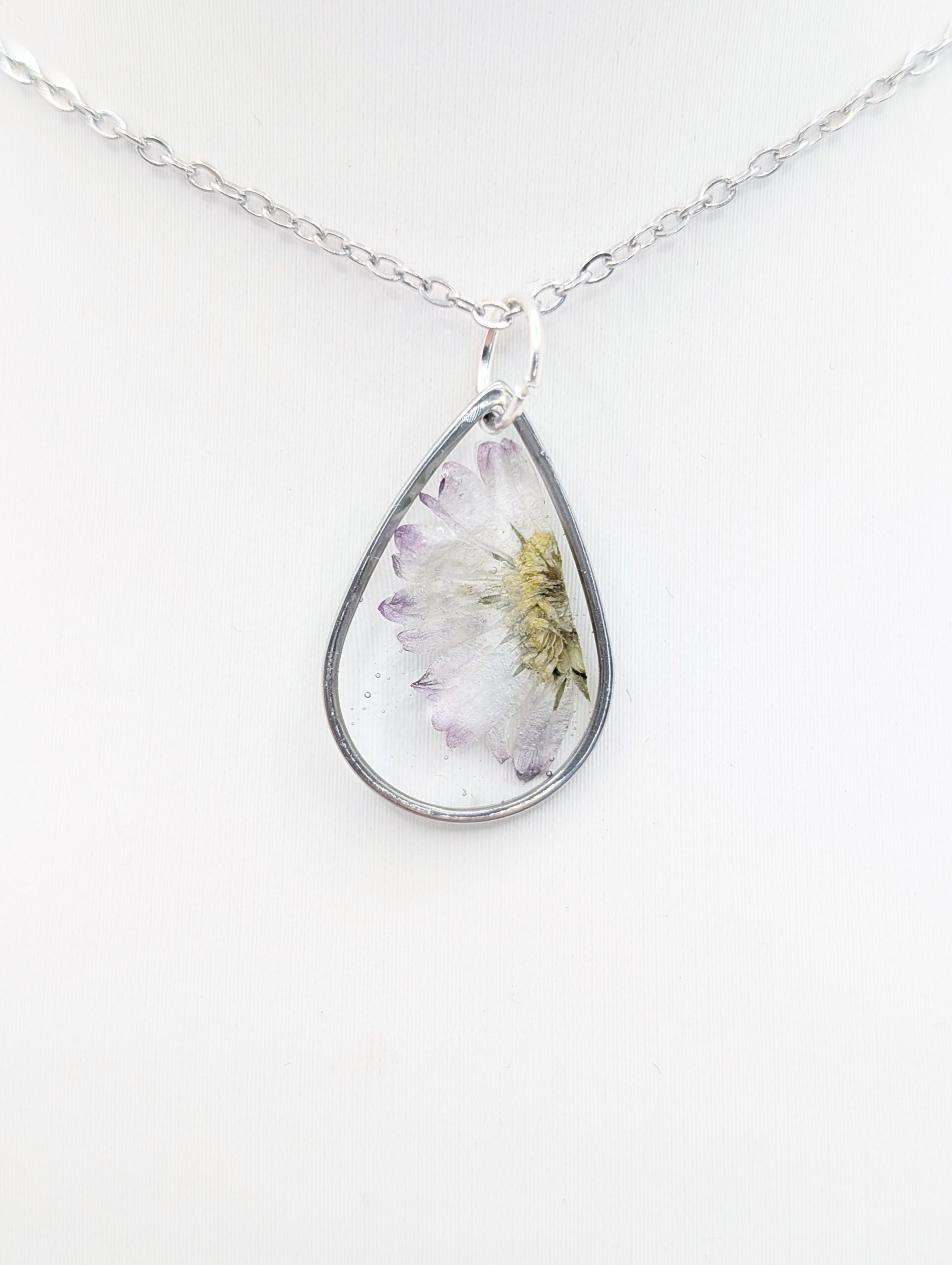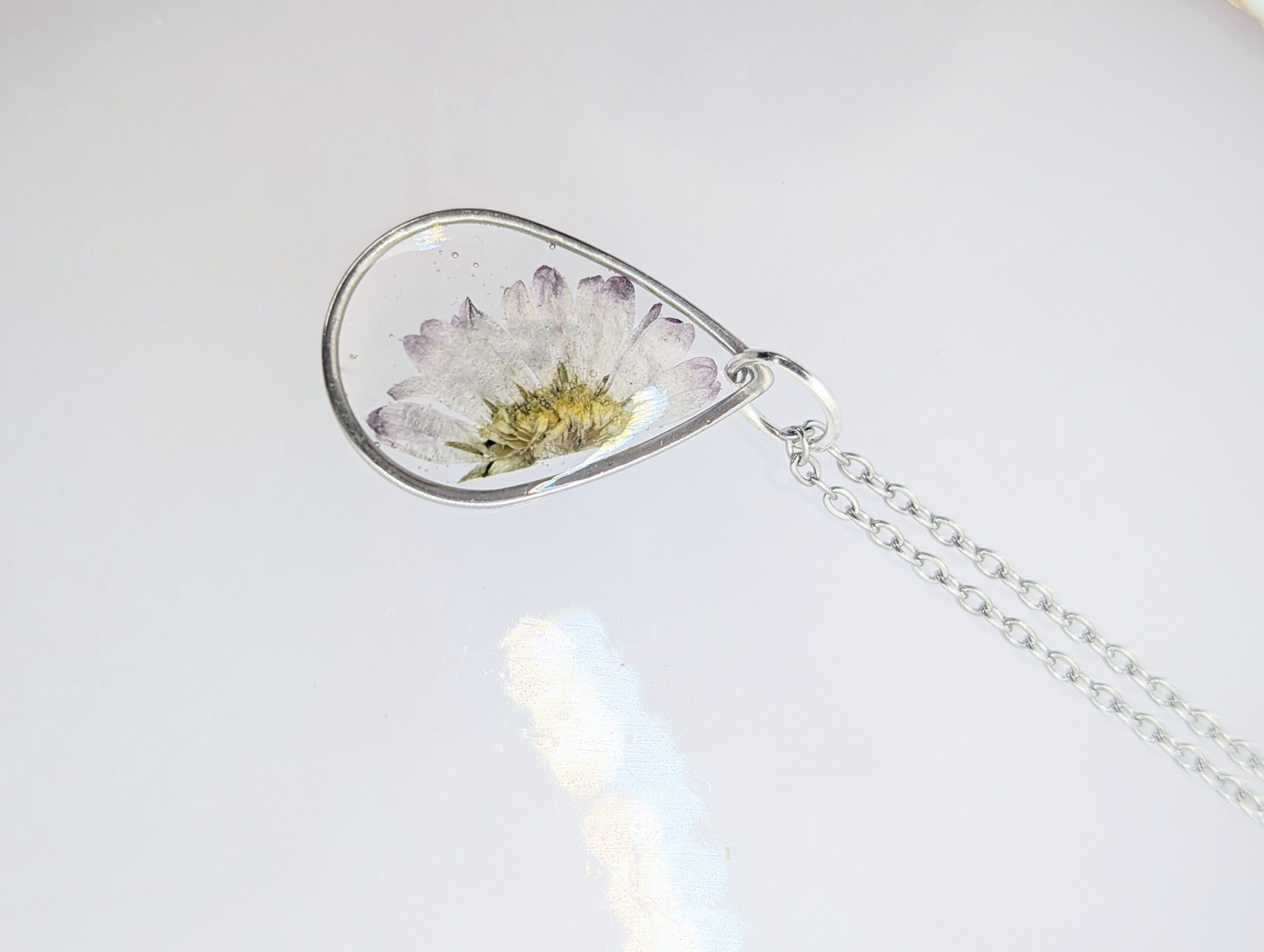 Natura tworzy najpiękniejsze detale, dlatego w moich projektach staram się jedynie wydobyć ich ukryty urok. Prezentowany naszyjnik z kwiatami to miniaturowy obrazek, który zamknęłam w srebrzystej oprawie. Wybrałam dla niego postać krystalicznej łezki, ponieważ ten kształt dodaje całości lekkości i pięknie eksponuje zatopioną roślinę. Wewnątrz krystalicznej tafli umieściłam prawdziwą stokrotkę, której białe płatki zdobi subtelna, różowa obwódka. Całość wykończyłam ramką w kolorze srebra, w rezultacie czego biżuteria nabrała nowoczesnego i świeżego charakteru. Kiedy światło przechodzi przez zawieszkę, różowe akcenty na końcach płatków ożywają, a dodatkowo zyskują wyjątkowy blask.