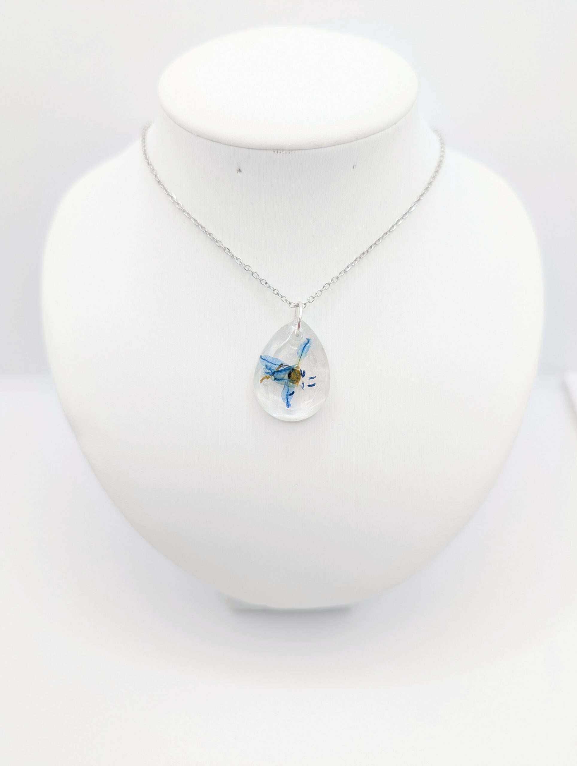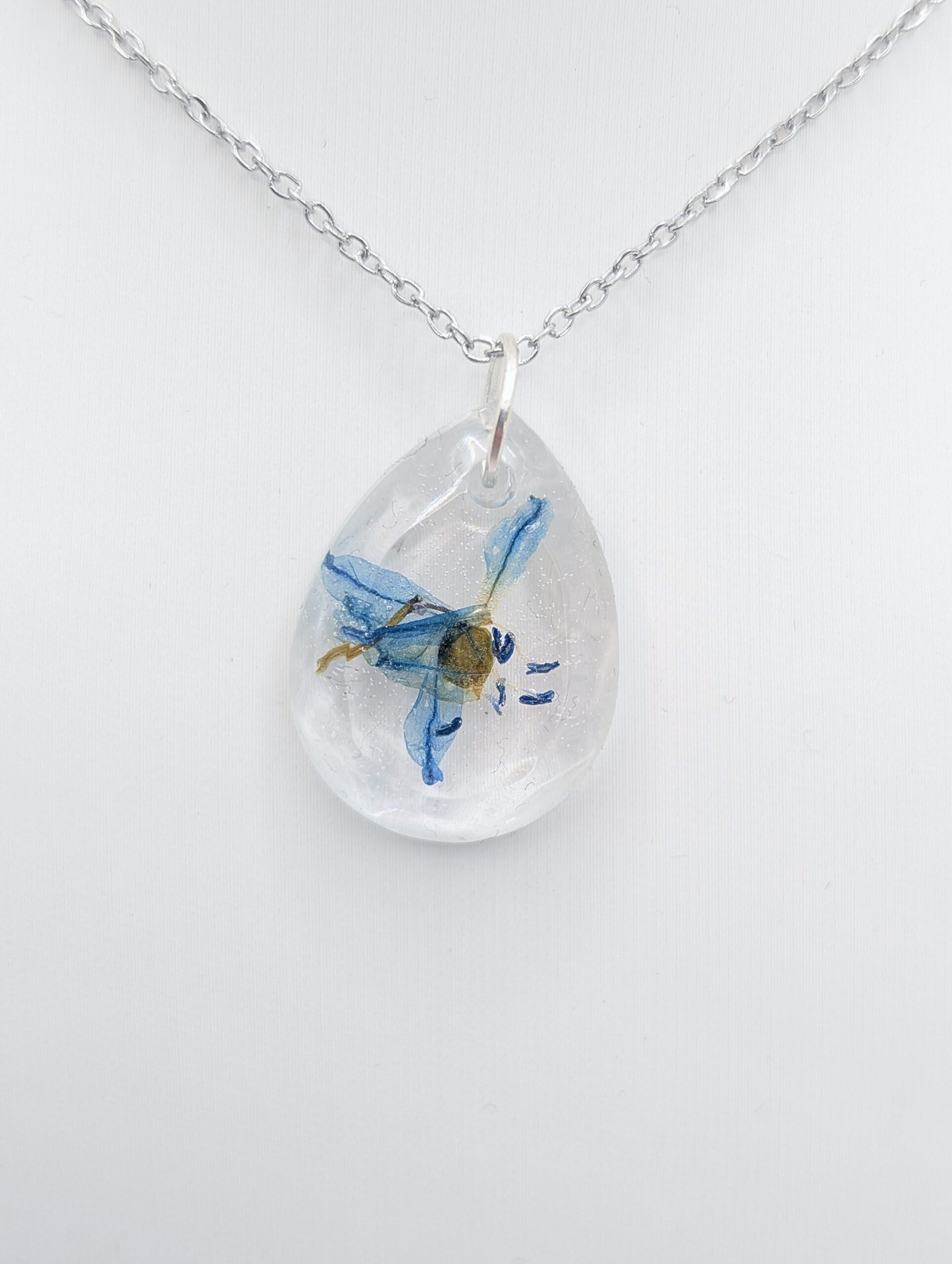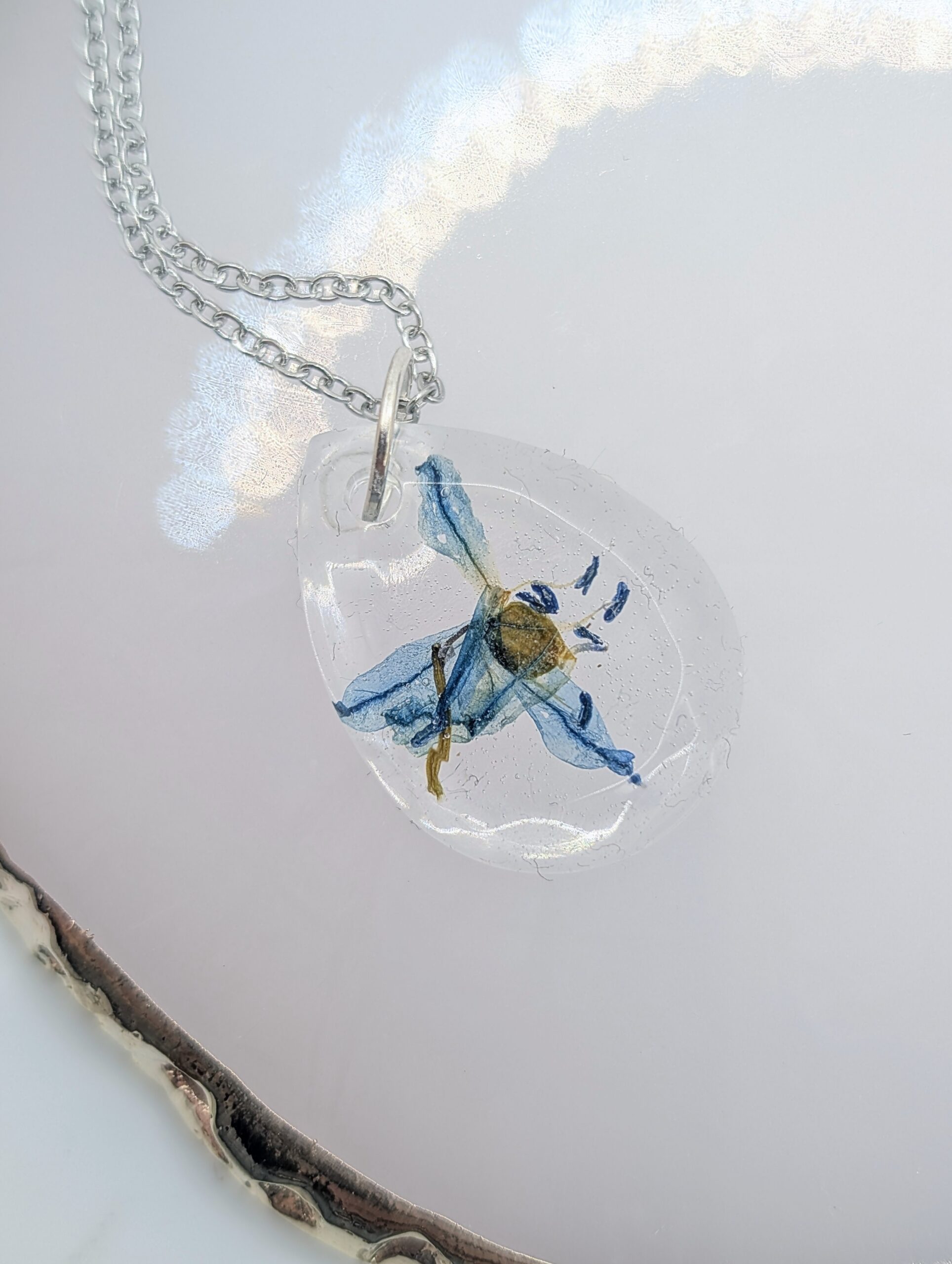 Ten ręcznie wykonany naszyjnik z kwiatem to pochwała prostoty i wyjątkowych, błękitnych barw wczesnej wiosny. Zawieszka ma kształt małej łezki. Dlatego jest ona lekka i bardzo wygodna w codziennym noszeniu. W jej wnętrzu zamknęłam cebulicę, która pod krystaliczną powłoką wygląda jak zatrzymana w czasie. Ponieważ zależało mi na chłodnej i czystej estetyce, całość połączyłam ze srebrnym łańcuszkiem ze stali szlachetnej. Dodatkowo wisior nie posiada metalowej oprawy. Dzięki temu światło swobodnie przenika przez materiał. W rezultacie otrzymujesz biżuterię o niezwykle subtelnym oraz nastrojowym charakterze.