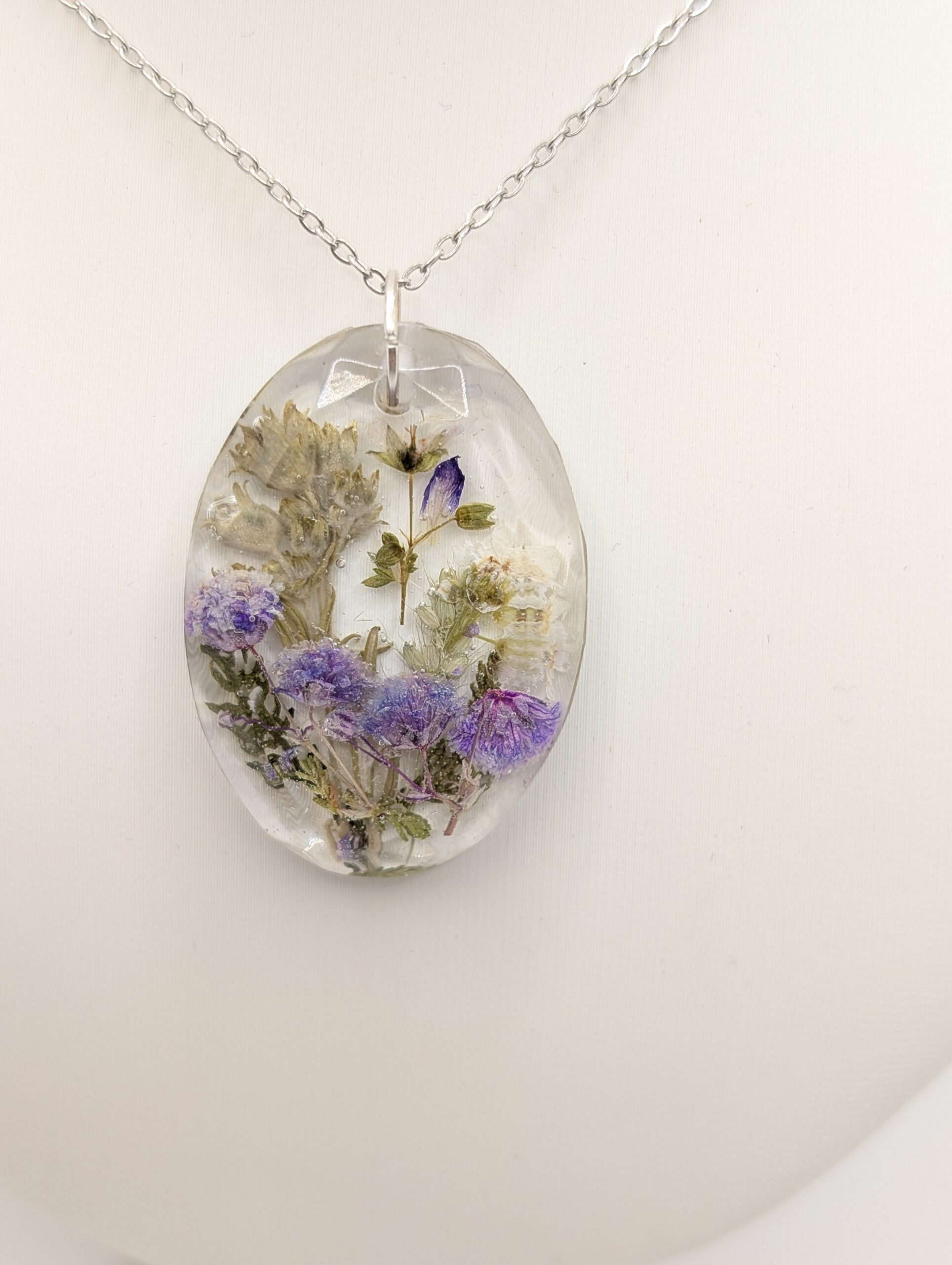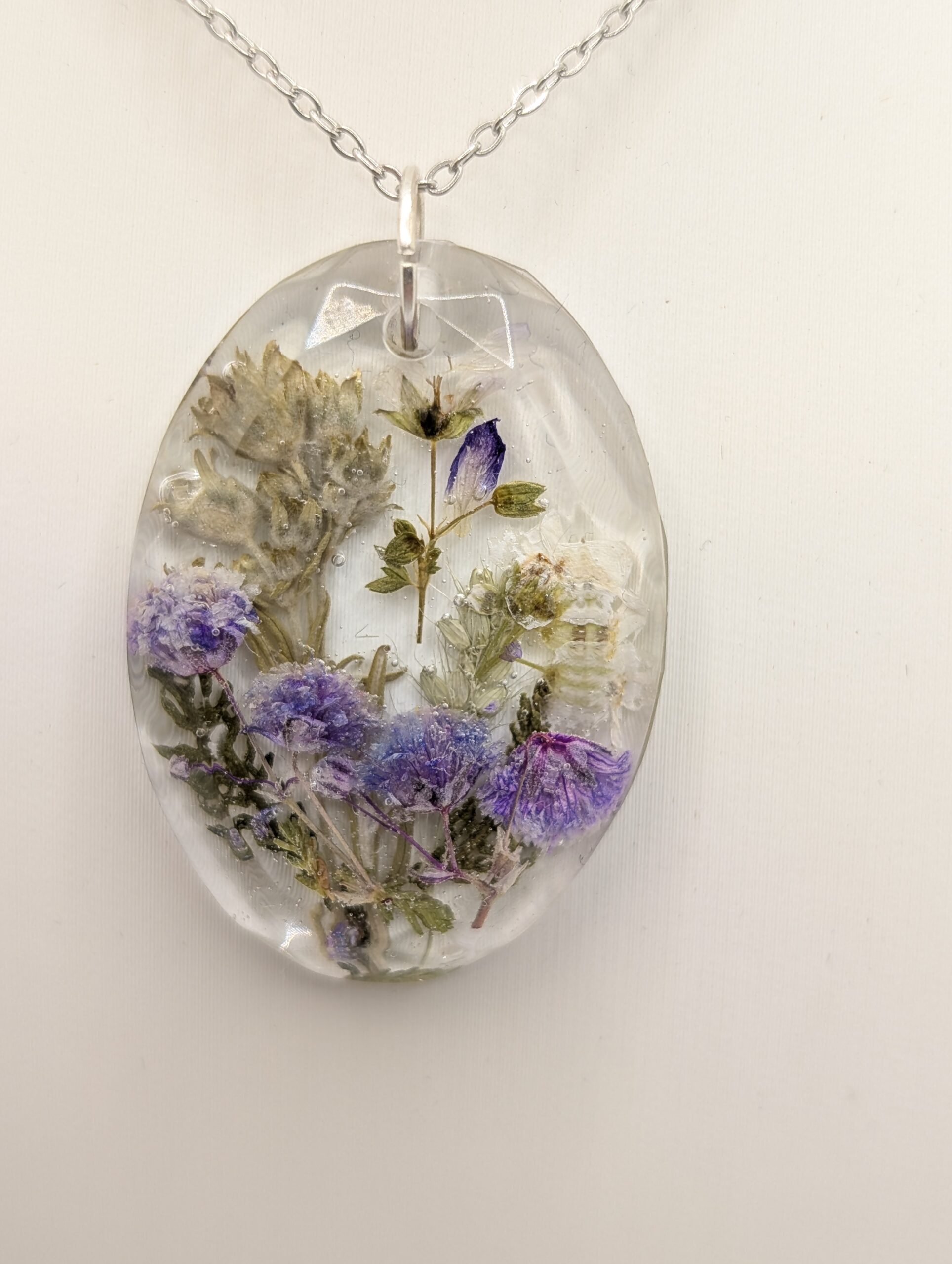 Tworzenie biżuterii w tak przejrzystej formie wymaga ode mnie dużej uważności, dlatego każdy kwiat i listek selekcjonuję oraz układam z ogromną starannością przed zalaniem formy. Ten konkretny naszyjnik z żywicy powstał z myślą o kobietach, które szukają dodatków wyrazistych, a jednocześnie bardzo bliskich naturze. Co więcej, krystaliczna żywica jubilerska doskonale konserwuje delikatne płatki fioletowych kwiatów, dzięki czemu zachowują one swoją formę i kolor na zawsze. Samodzielnie poleruję gotowy odlew, ponieważ zależy mi na uzyskaniu idealnej przejrzystości, która pozwala podziwiać misterny układ botanicznego wnętrza.