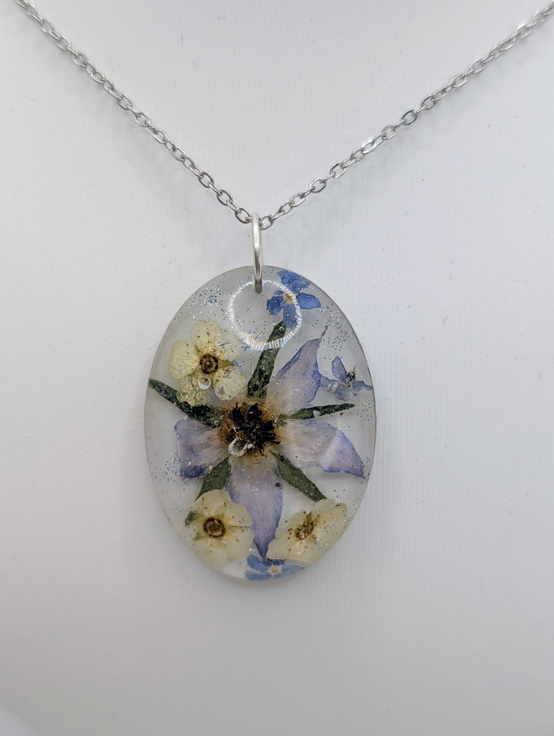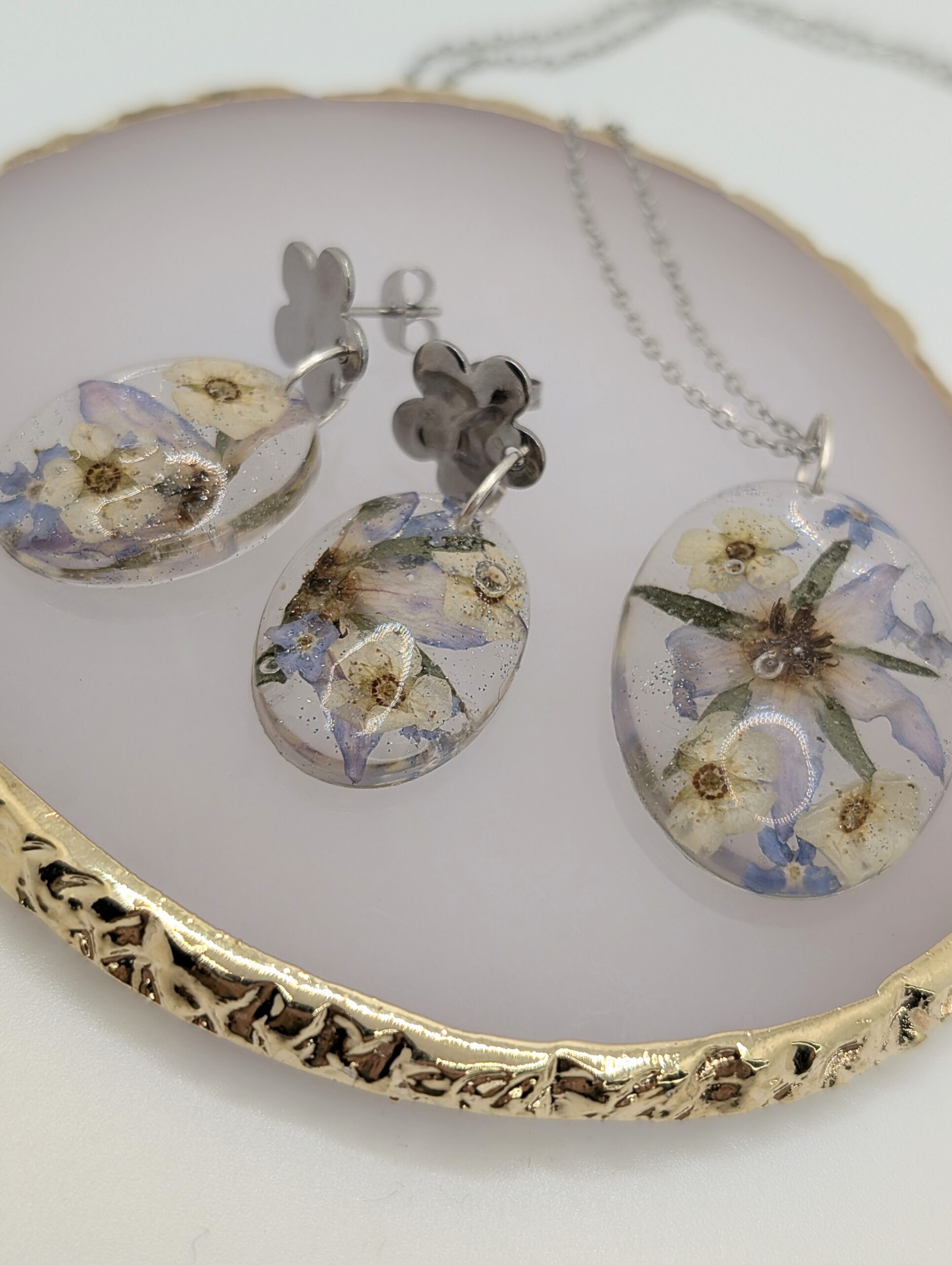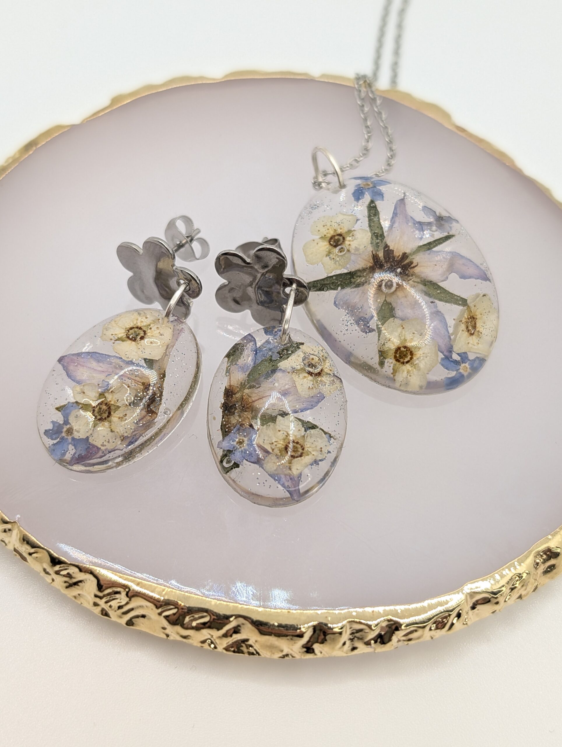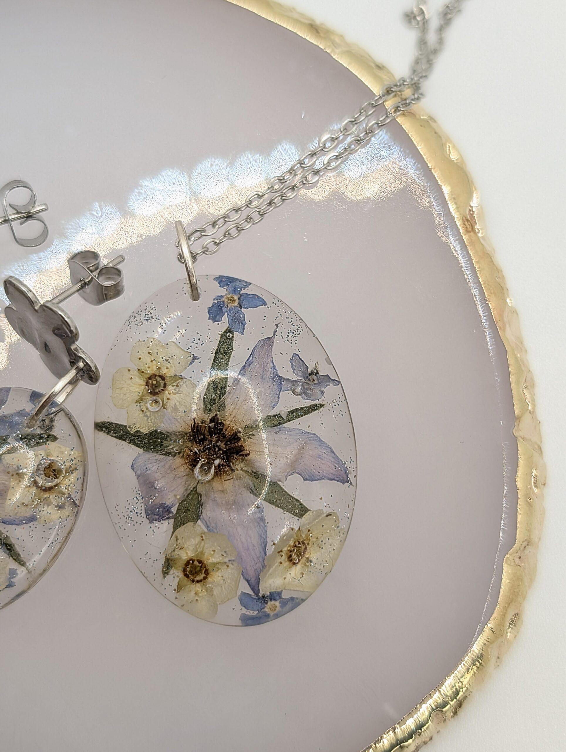 Materiał: żywica jubilerska, suszone rośliny, stal szlachetna.