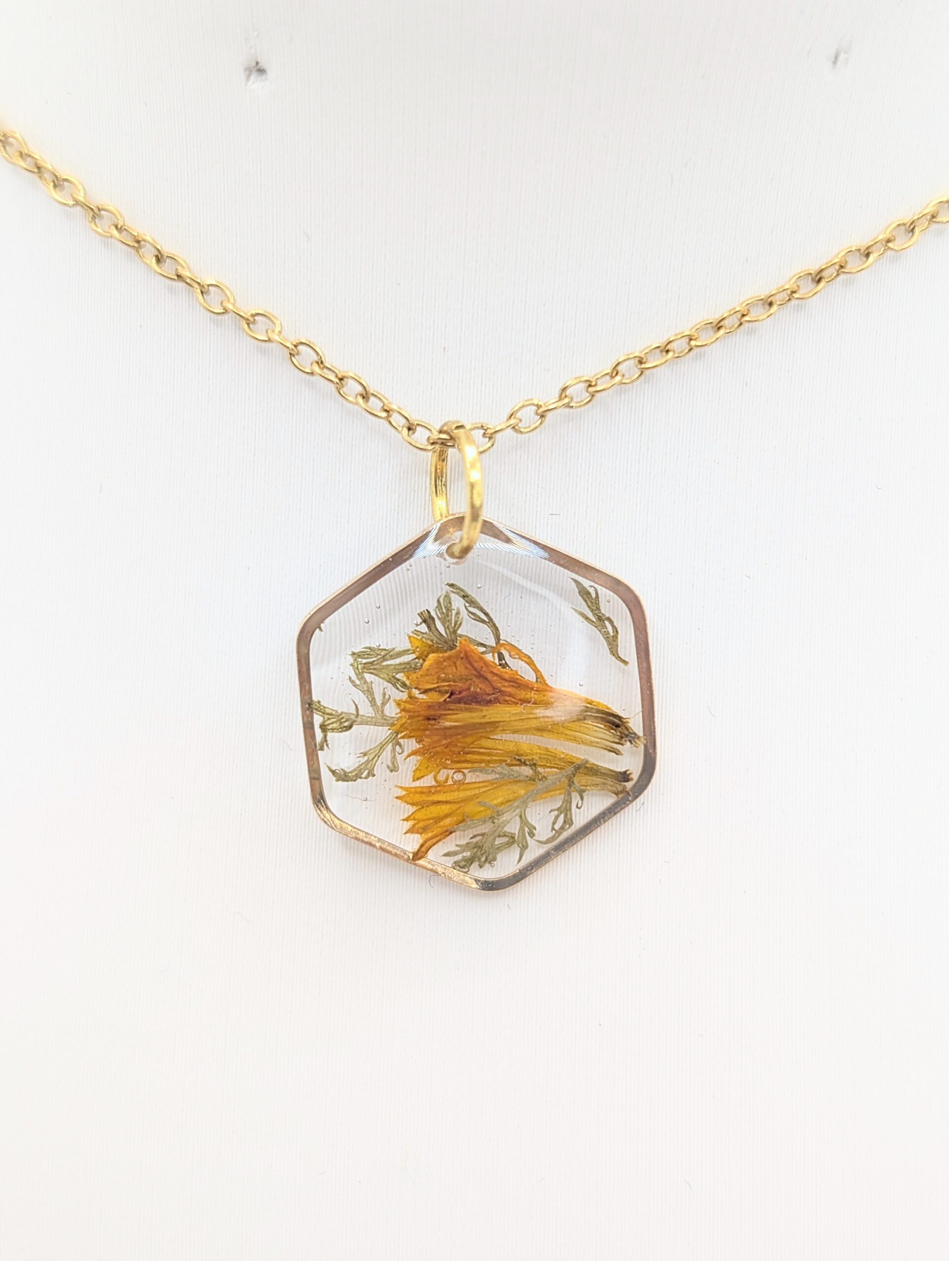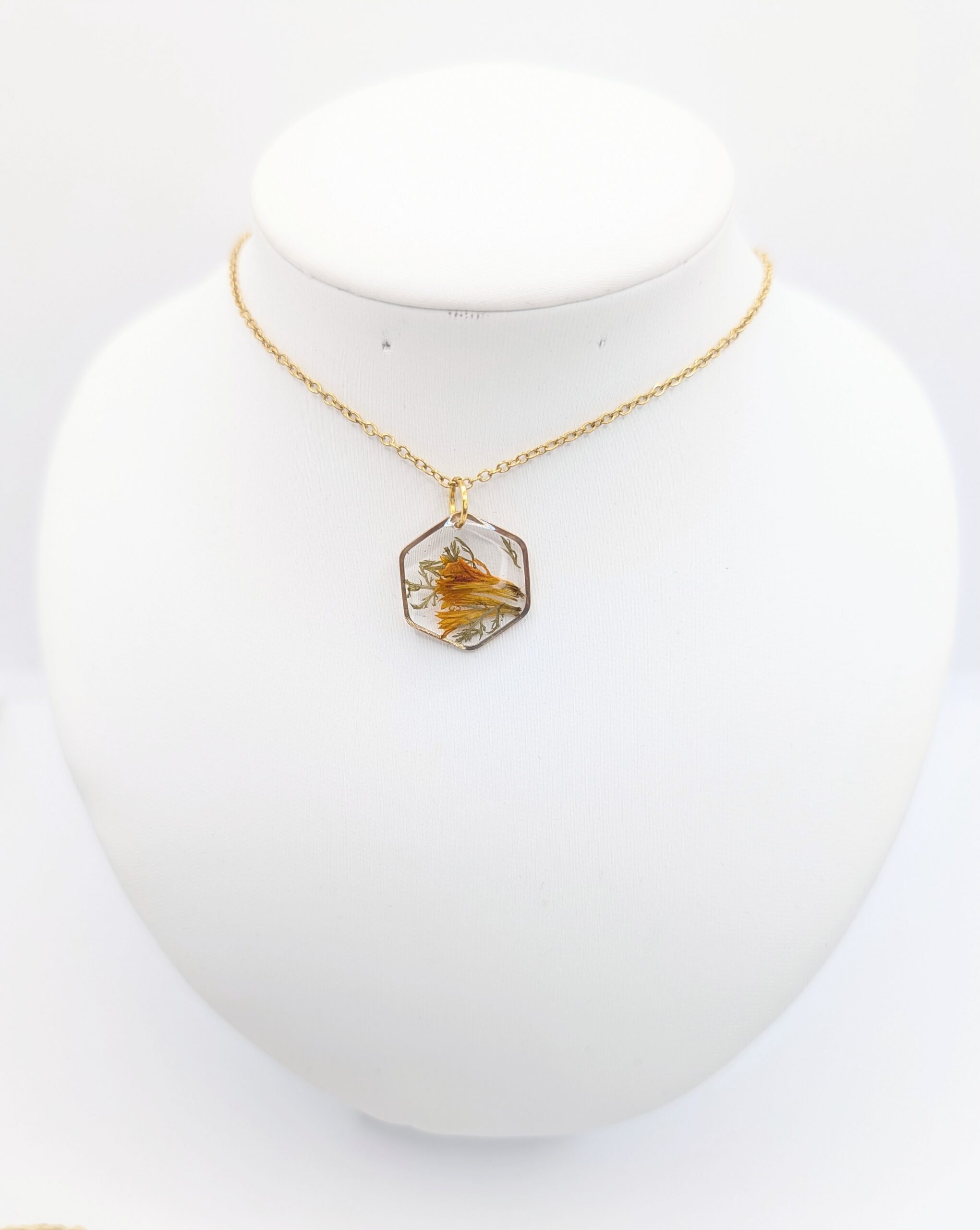 Natura projektuje najpiękniejsze detale, dlatego w moich pracach staram się jedynie stworzyć dla nich nowoczesną oprawę. Ten unikatowy naszyjnik z żywicy łączy w sobie surowość geometrycznego kształtu z delikatnością letnich kwiatów. Wewnątrz złotej ramki w formie heksagonu zamknęłam intensywnie pomarańczowe płatki, które otoczyłam drobnymi, zielonymi listkami. Wybrałam taką kompozycję, ponieważ ciepły odcień złota idealnie podkreśla energetyczną barwę roślin, nadając biżuterii wyrazistego charakteru. Kiedy promień słońca dotknie transparentnej powierzchni, zatopione detale ukazują swoją strukturę, a dodatkowo zachwycają naturalną głębią kolorów.