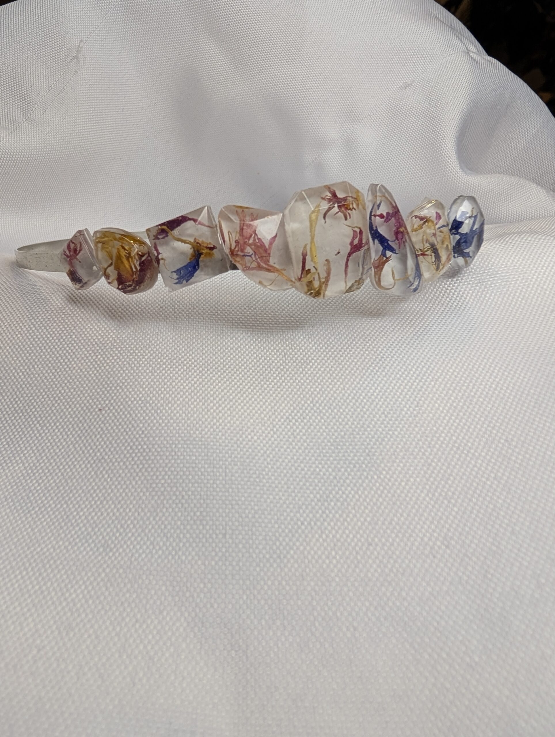 Materiał: Żywica jubilerska (odporna na UV), suszone płatki kwiatów, elastyczna baza opaski.