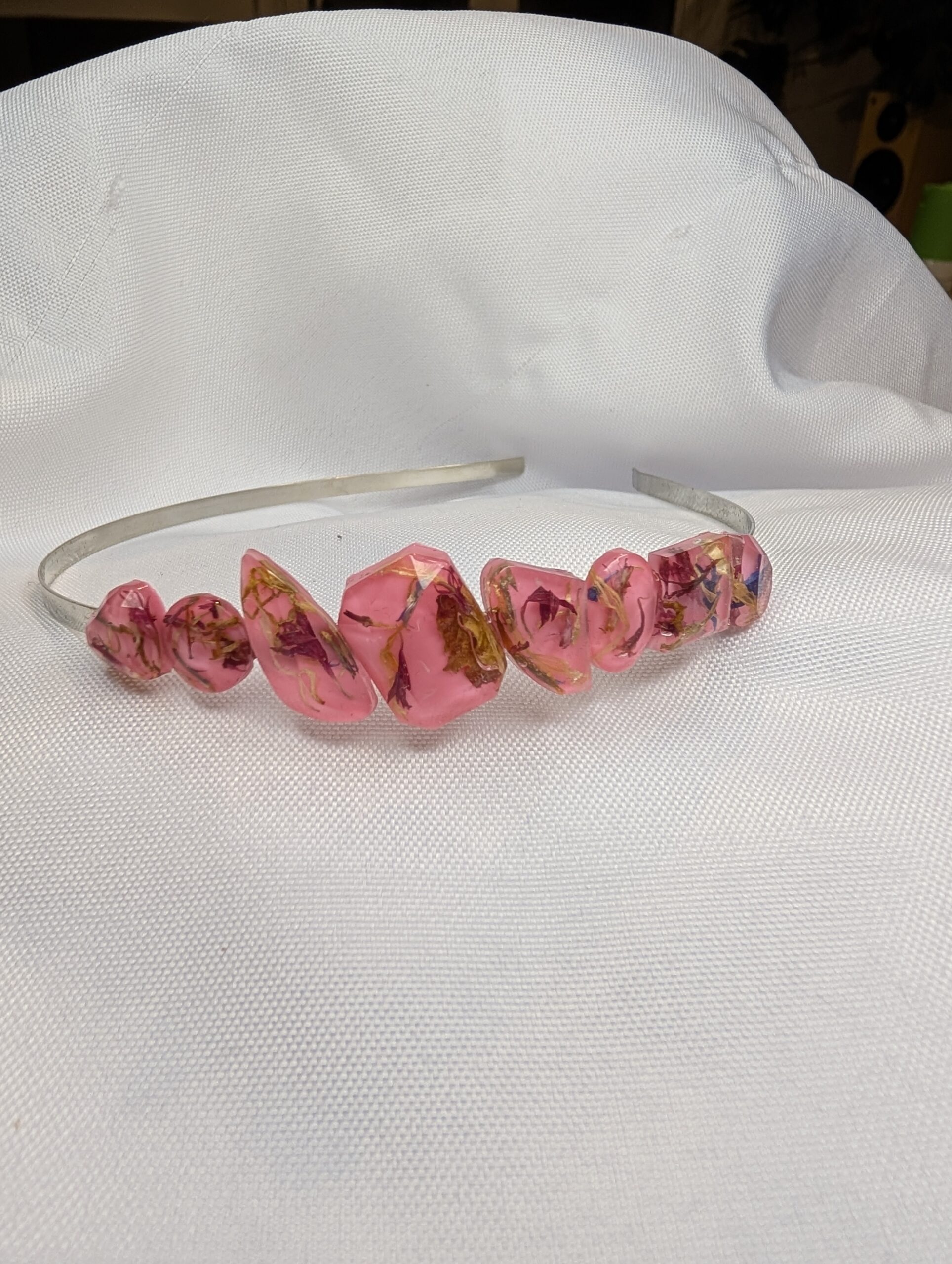 Motyw: Opaska z kwiatem, geometryczne kryształy, jasnoróżowa żywica.