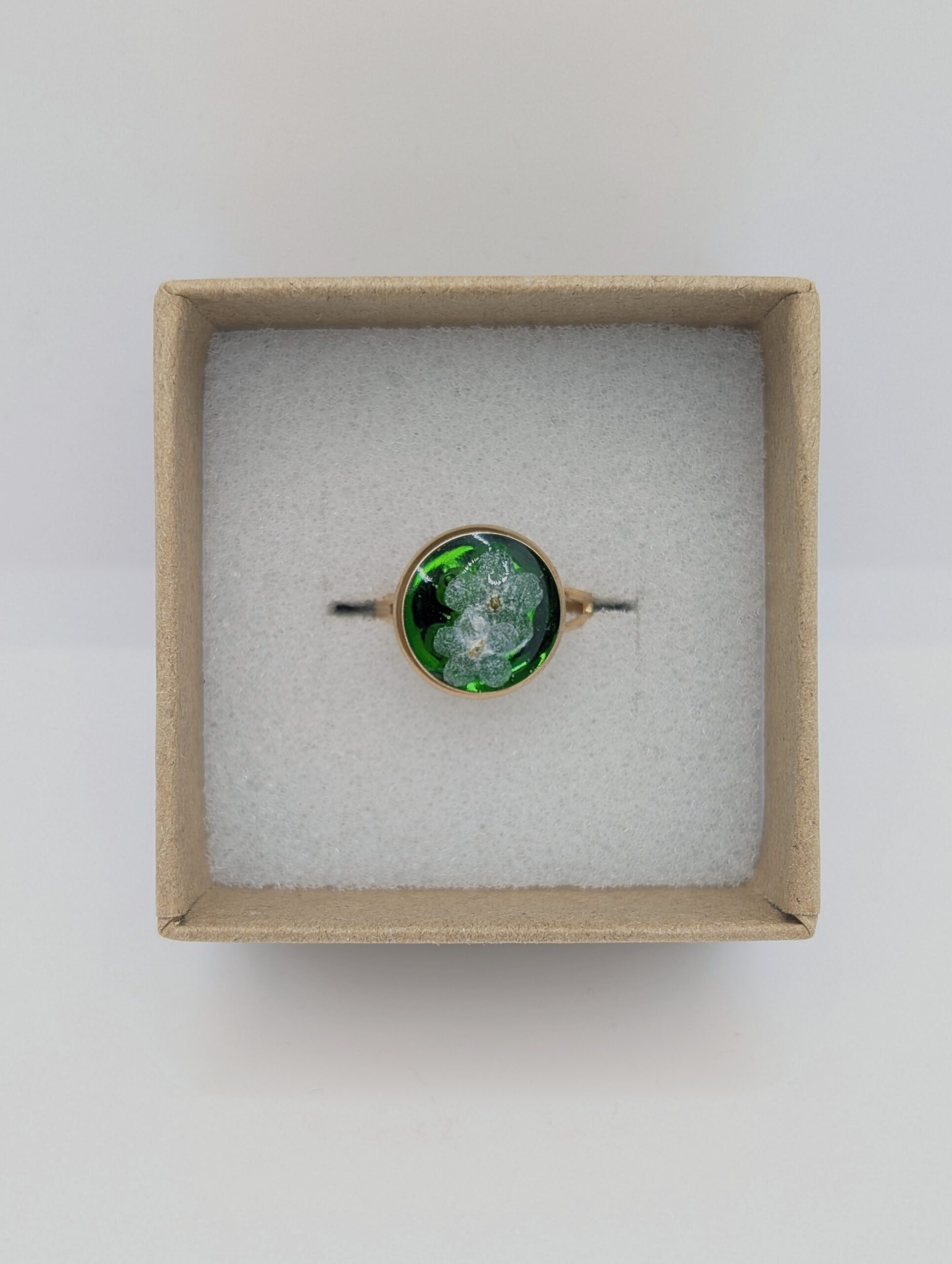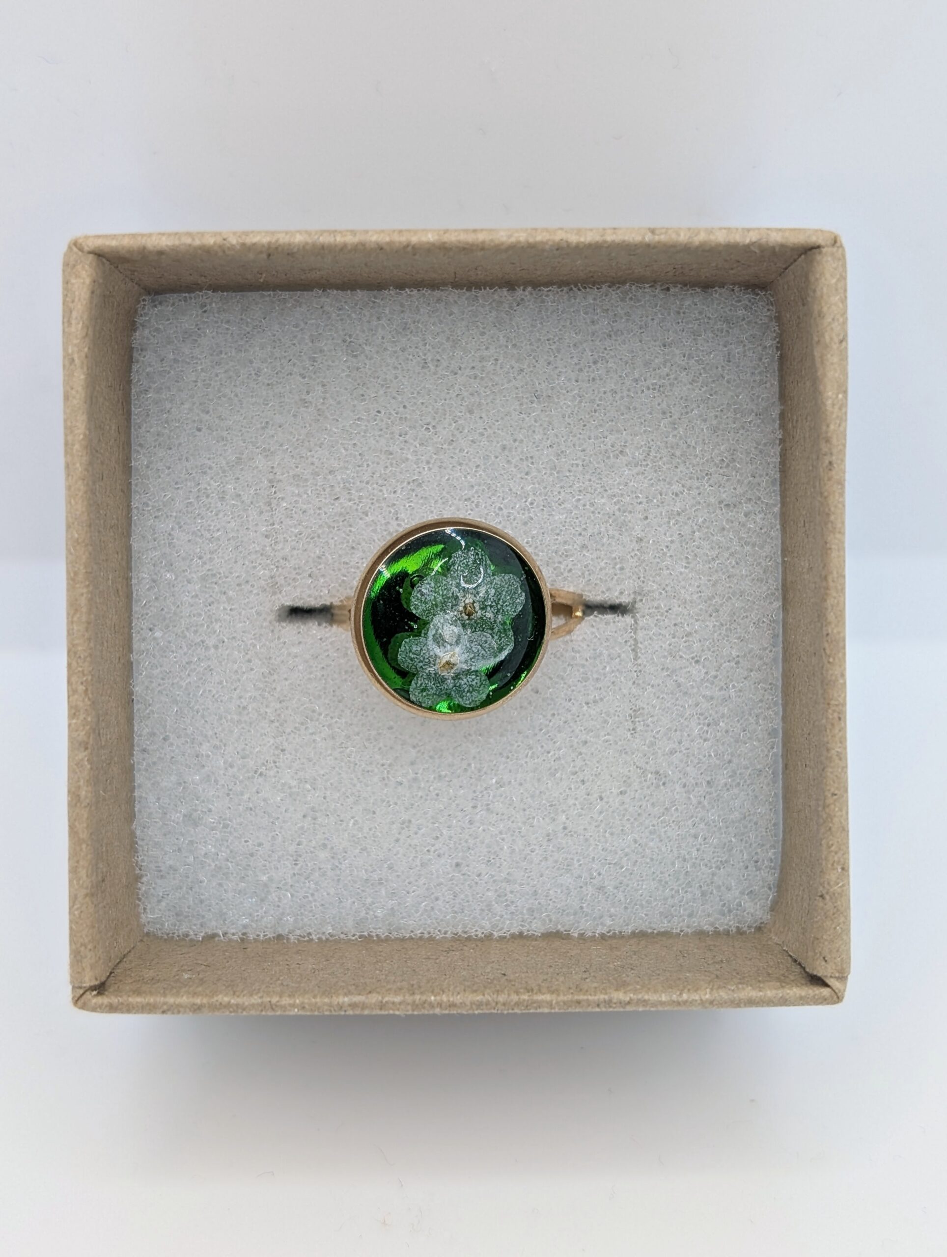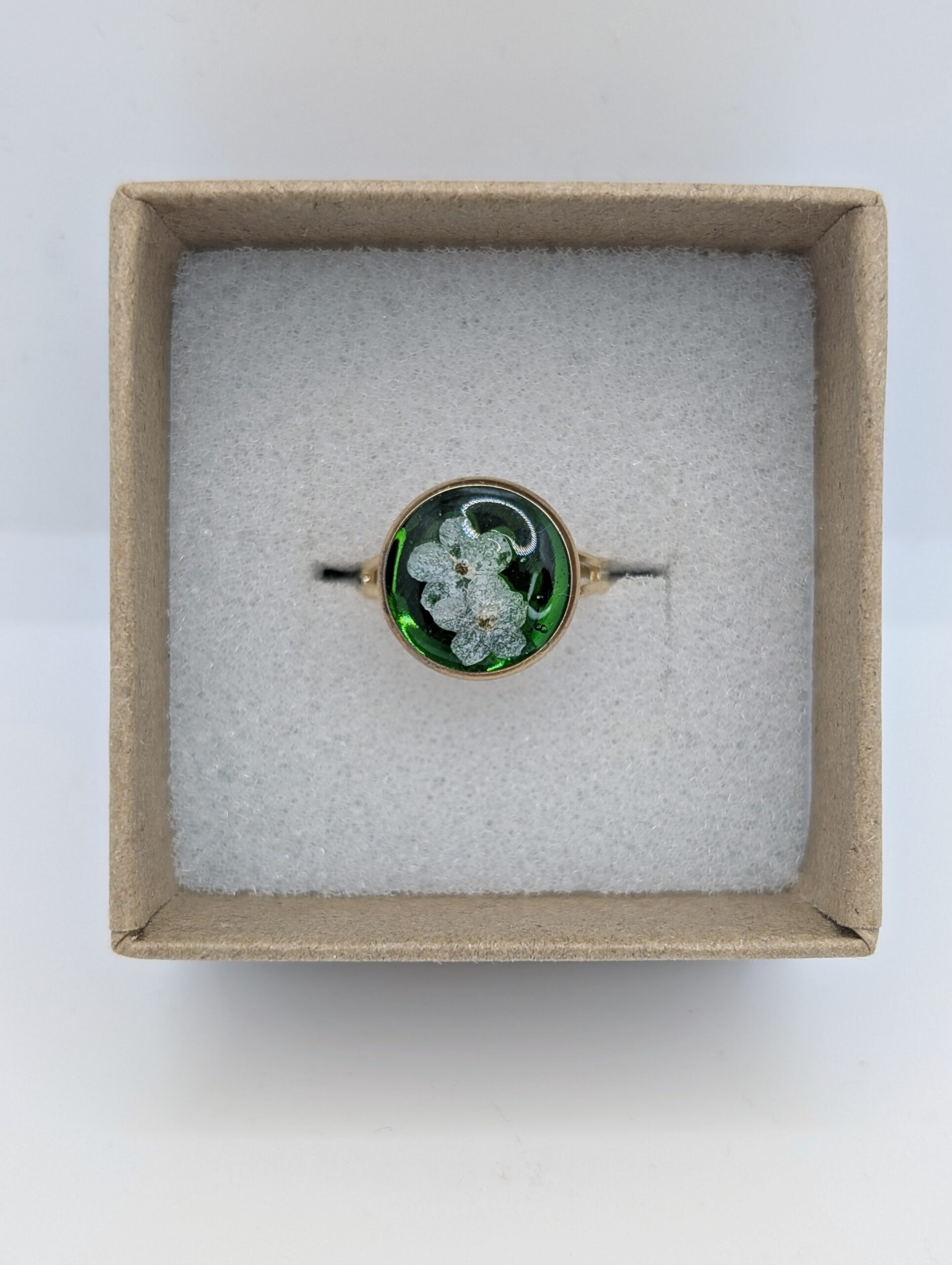Pierścionek z kwiatami „Szmaragdowa Głębia” – biała niezapominajka i złoto