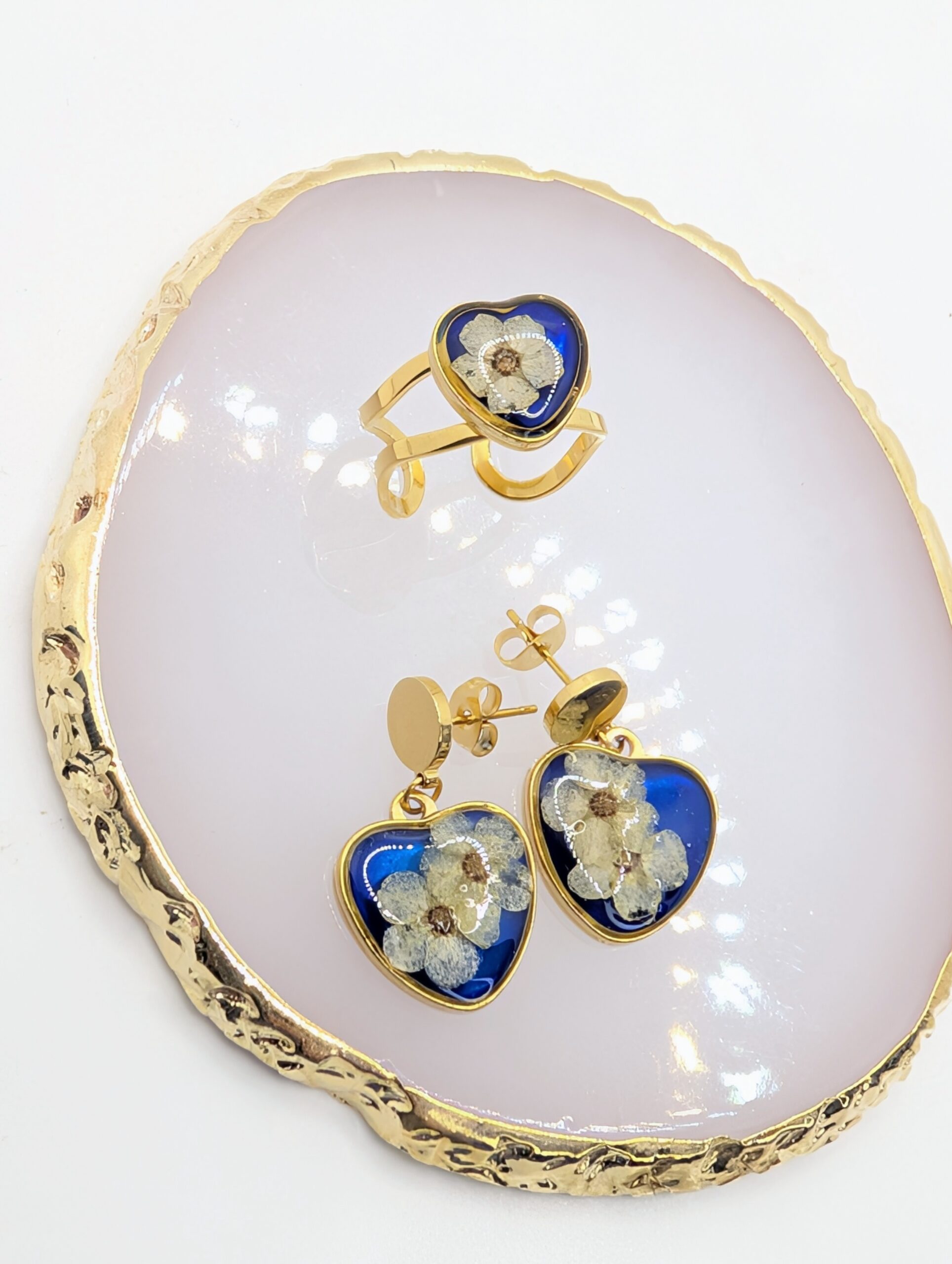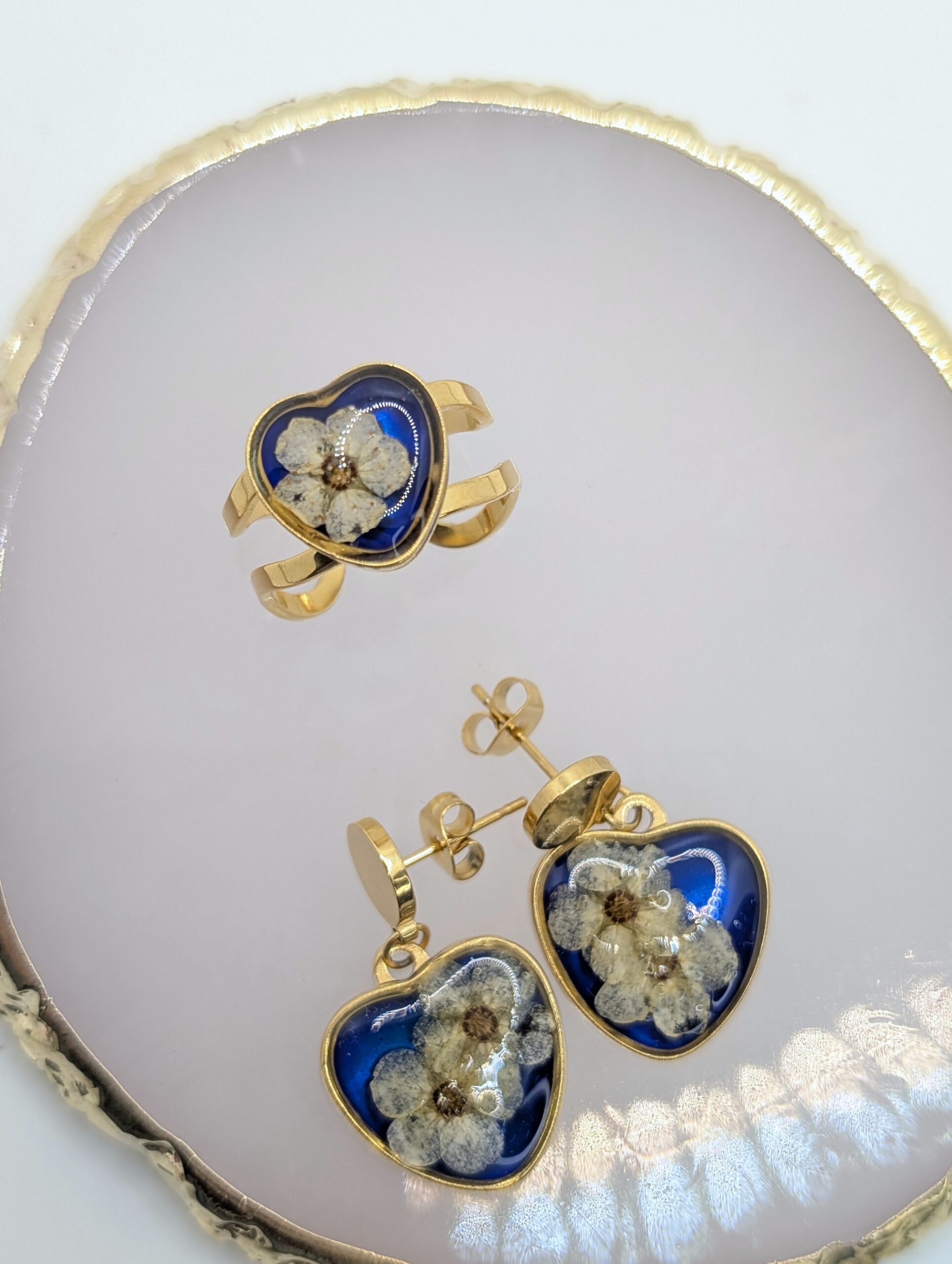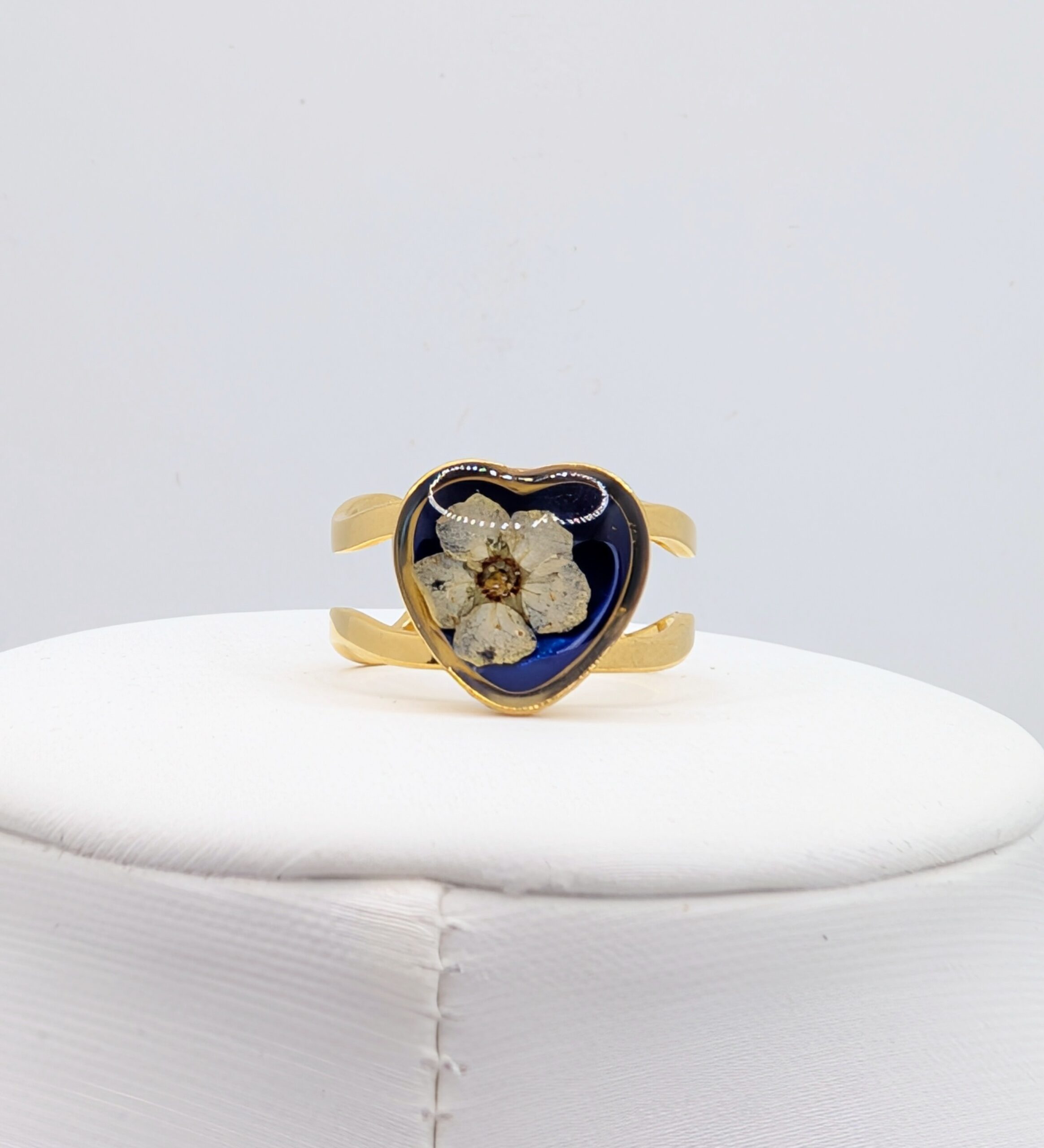 Ten ręcznie wykonany pierścionek z kwiatem zachwyca intensywnością barw oraz precyzją wykonania. Wewnątrz złotej oprawy w kształcie serca umieściłam białe kwiaty tawuły, które wyraźnie odcinają się od nasyconego, niebieskiego tła. Ponieważ zależało mi na uzyskaniu efektu głębi, kolor tła nawiązuje do bezchmurnego, letniego nieba. Całość została zabezpieczona krystaliczną żywicą. Dzięki temu kompozycja roślinna jest trwale chroniona i pięknie lśni w świetle. W rezultacie otrzymujesz biżuterię, która jest nie tylko ozdobą, ale i małym dziełem rzemiosła.