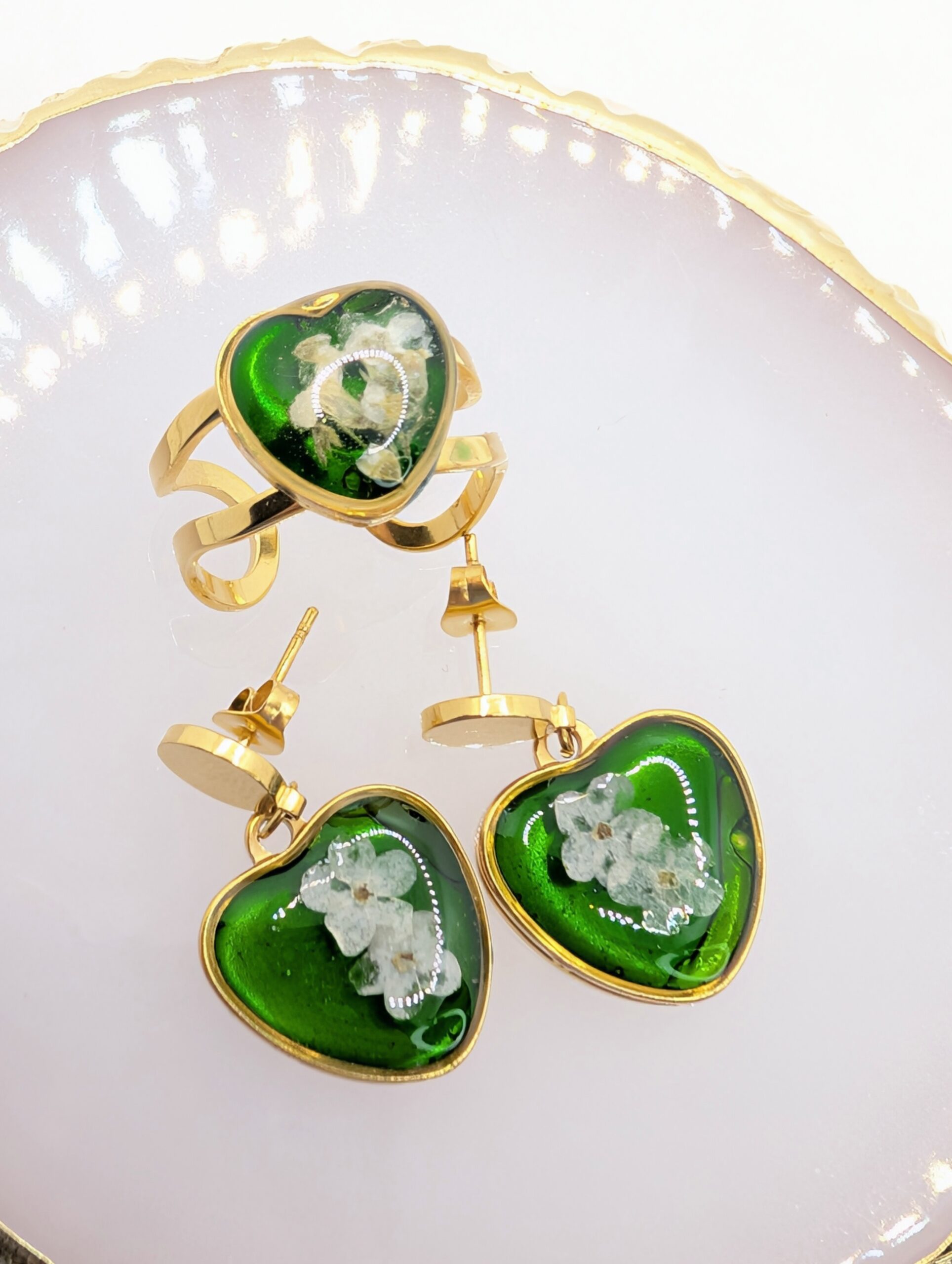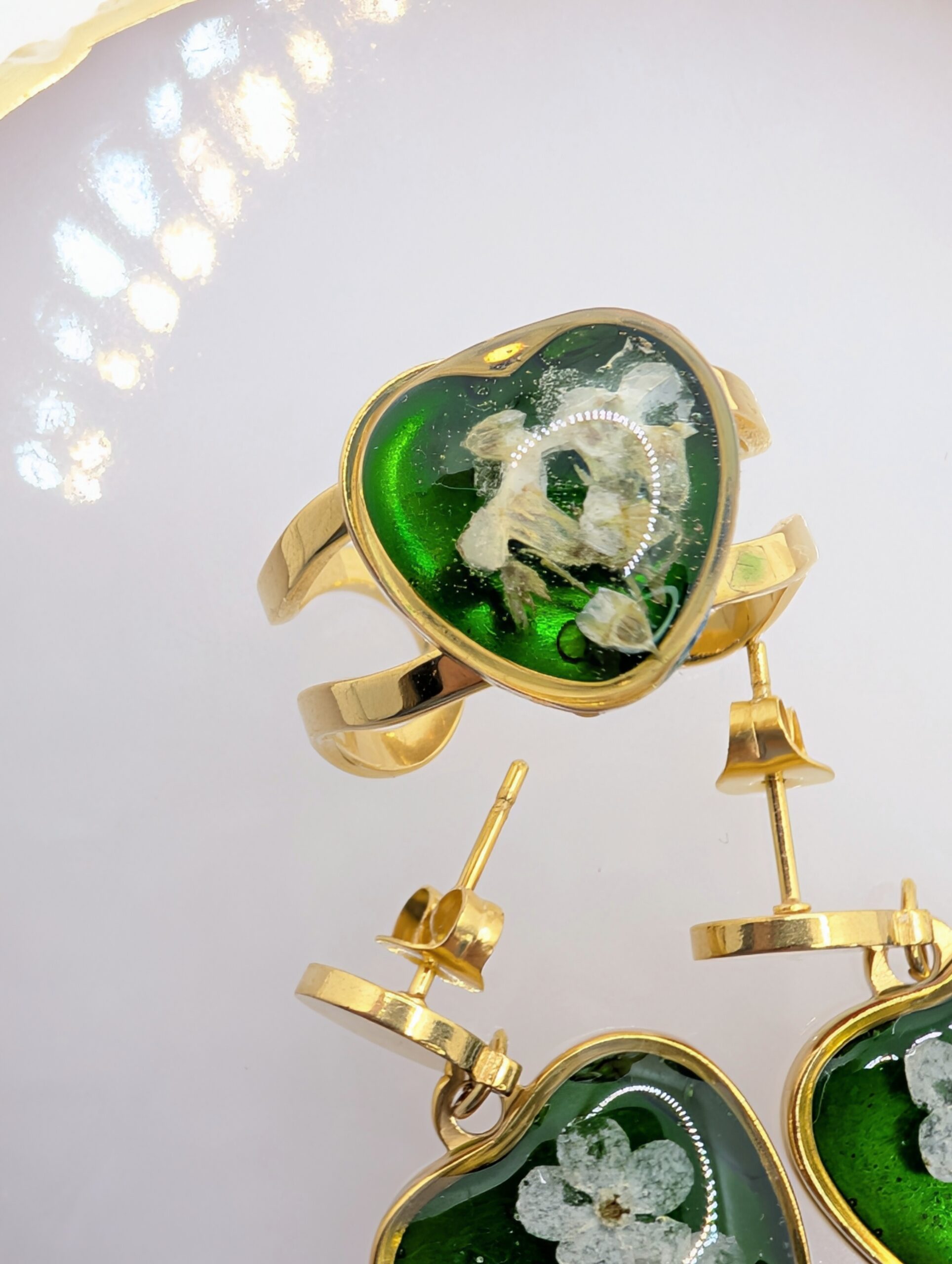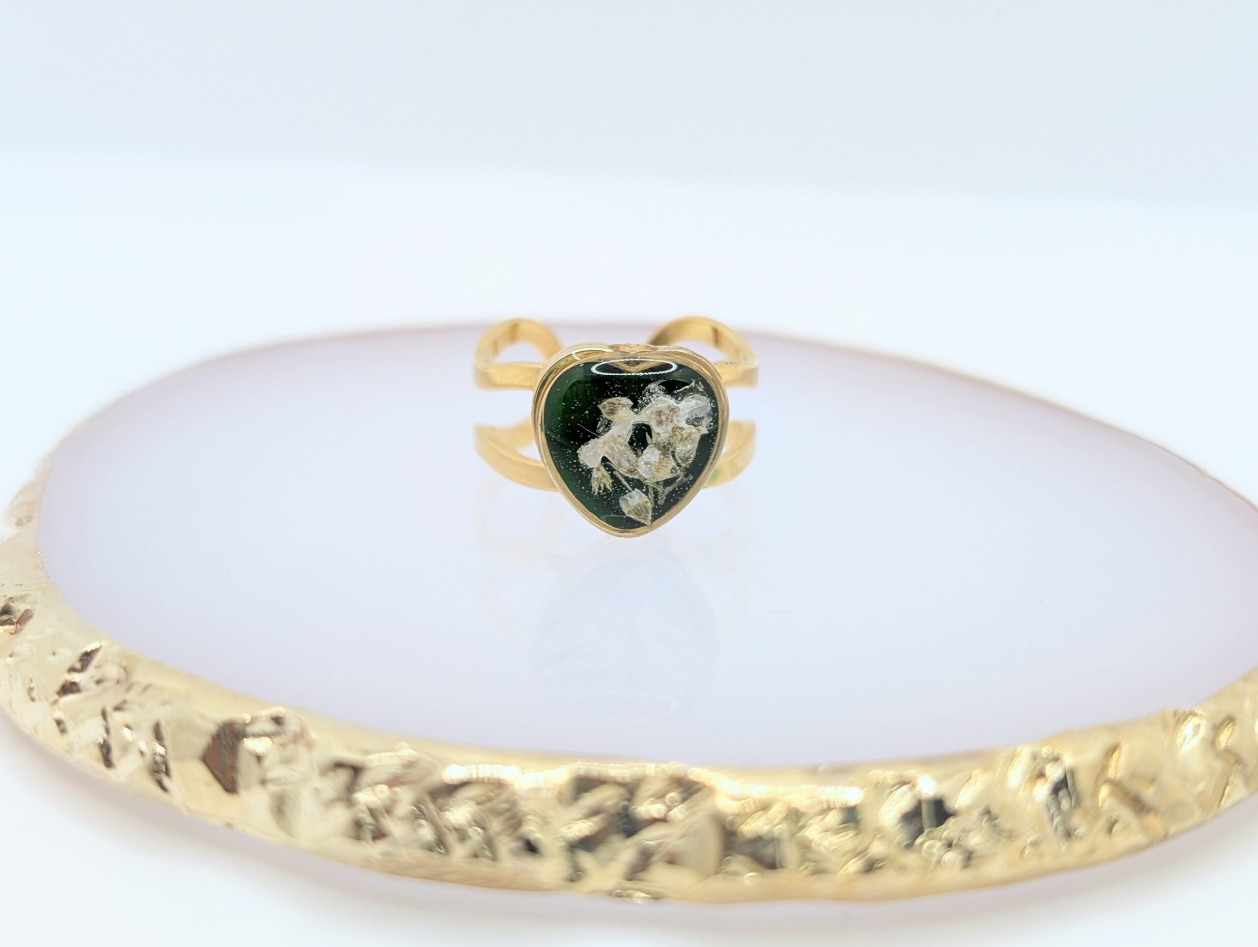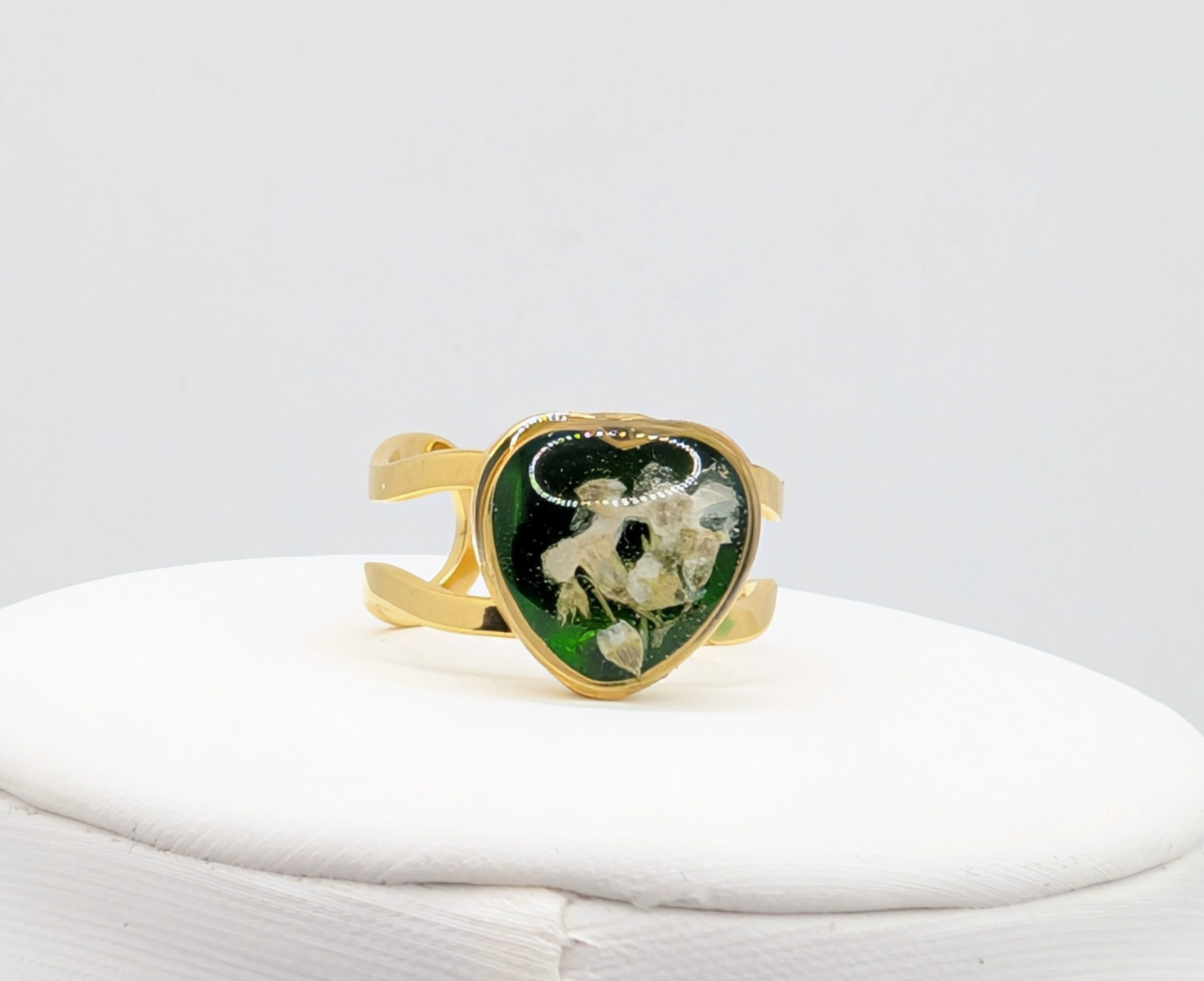 Ten ręcznie wykonany pierścionek z kwiatem zachwyca intensywnością barw oraz precyzją wykonania. Wewnątrz złotej oprawy w kształcie serca umieściłam białe kwiaty niezapominajki, które wyraźnie odcinają się od nasyconego, zielonego tła. Ponieważ zależało mi na uzyskaniu efektu głębi, kolor tła nawiązuje do szlachetnego odcienia szmaragdu. Całość została zabezpieczona krystaliczną żywicą. Dzięki temu kompozycja roślinna jest trwale chroniona i pięknie lśni w świetle. W rezultacie otrzymujesz biżuterię, która jest nie tylko ozdobą, ale i małym dziełem rzemiosła.