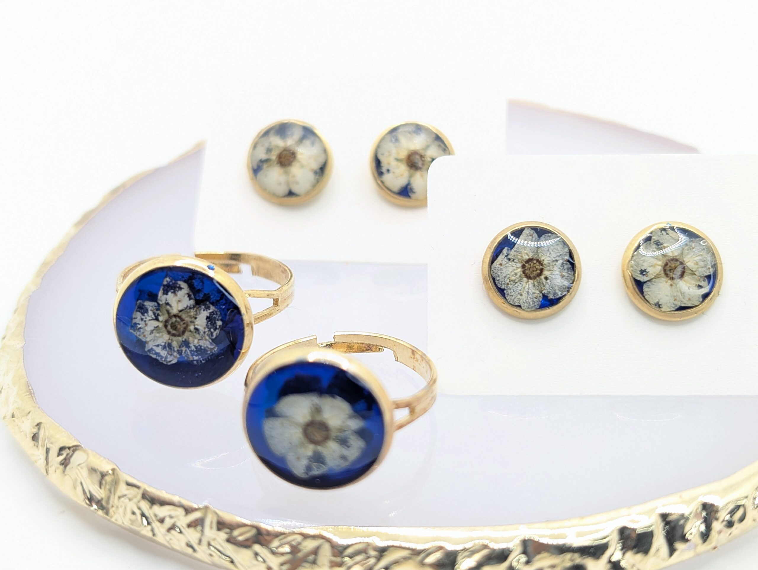 Pierścionek z żywicy „Głębia Nieba”. Poczuj bliskość natury zamkniętą w eleganckiej, złotej formie. Regulowana oprawa z prawdziwą białą tawułą na granatowym tle to autorski projekt, który tworzę własnoręcznie w mojej pracowni. Model ten stanowi idealne dopełnienie zestawu ze złocistymi kolczykami i bransoletką z tej samej linii. Ponieważ w każdy egzemplarz wkładam mnóstwo pasji, zyskujesz dodatek o unikatowym charakterze. Wybierz jakość od Kwiato-Stany.