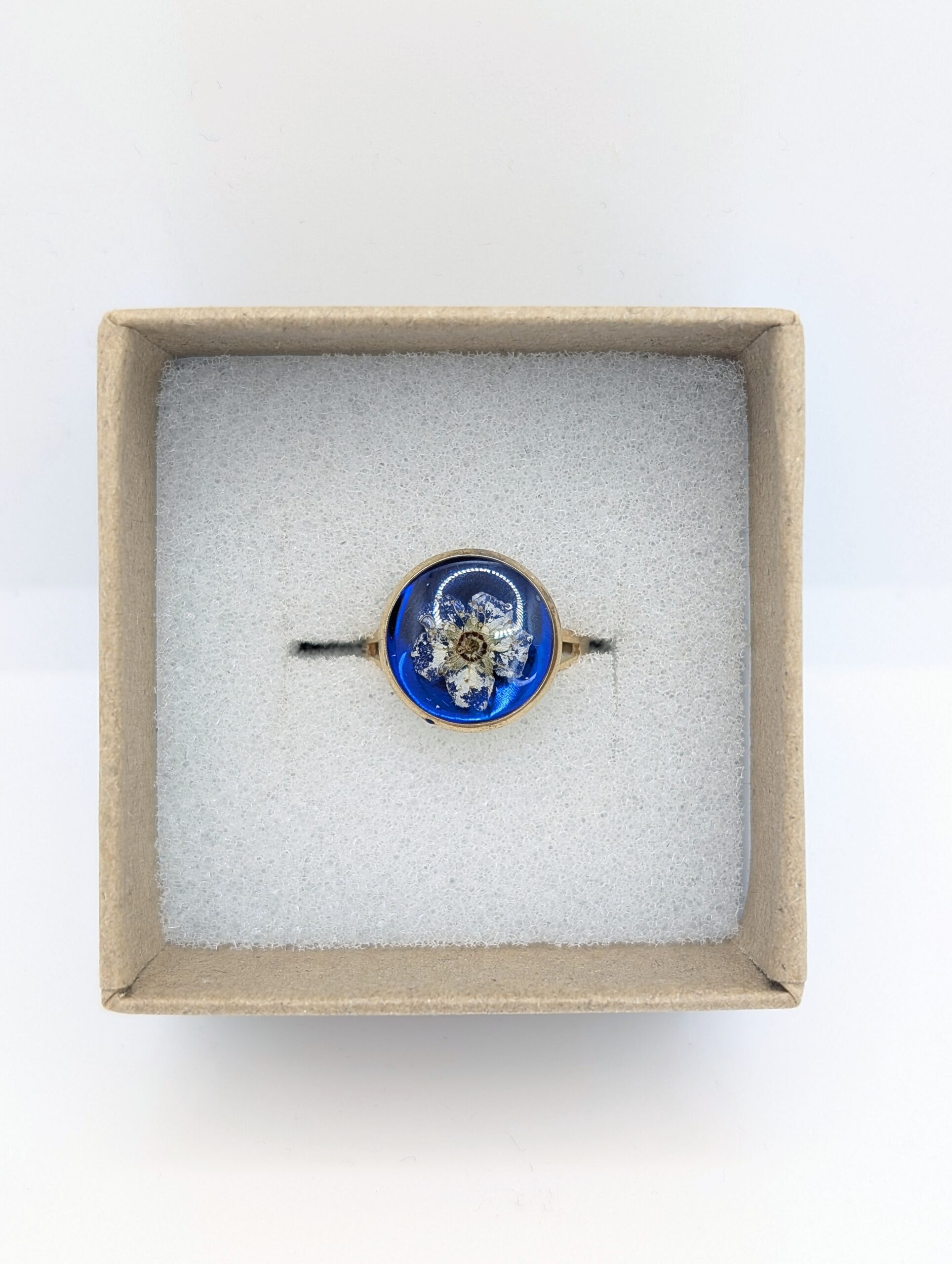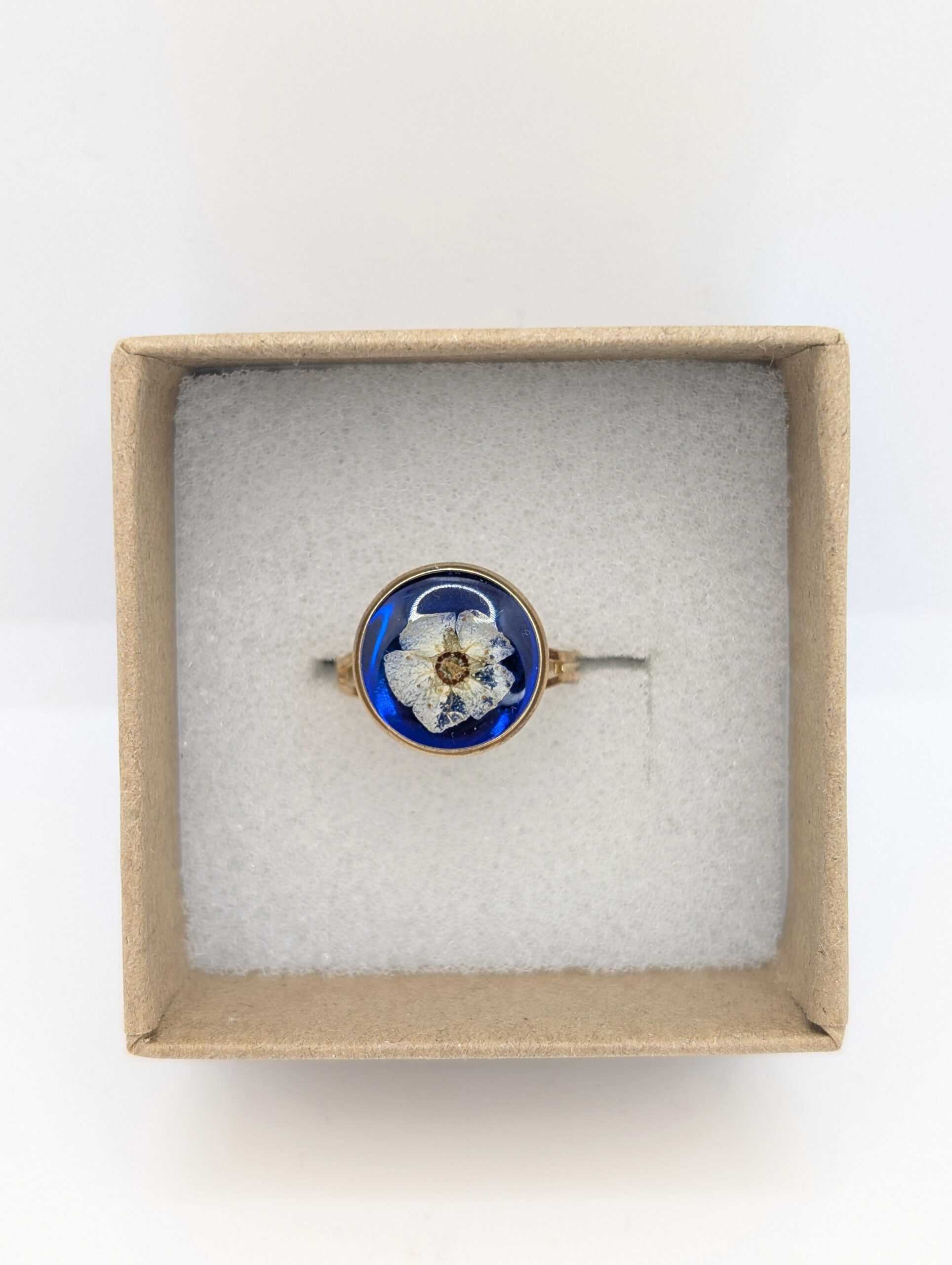 Ten ręcznie wykonany pierścionek z żywicy to mały kawałek natury, który możesz mieć zawsze na wyciągnięcie ręki. Wewnątrz okrągłej, złocistej oprawy zamknęłam delikatną białą tawułę, której płatki kontrastują z głębokim, granatowym tłem. Kompozycja ta przywodzi na myśl nocne niebo rozświetlone blaskiem gwiazd. Ponieważ tawuła symbolizuje wdzięk i subtelną radość, biżuteria ta emanuje spokojem oraz nostalgicznym pięknem. Złociste wykończenie oprawy otula roślinę ukrytą pod gładką, lśniącą taflą, co nadaje całości wyjątkowej głębi. W rezultacie otrzymujesz dodatek, który nie tylko zdobi dłoń, ale też przyciąga wzrok i wywołuje uśmiech.