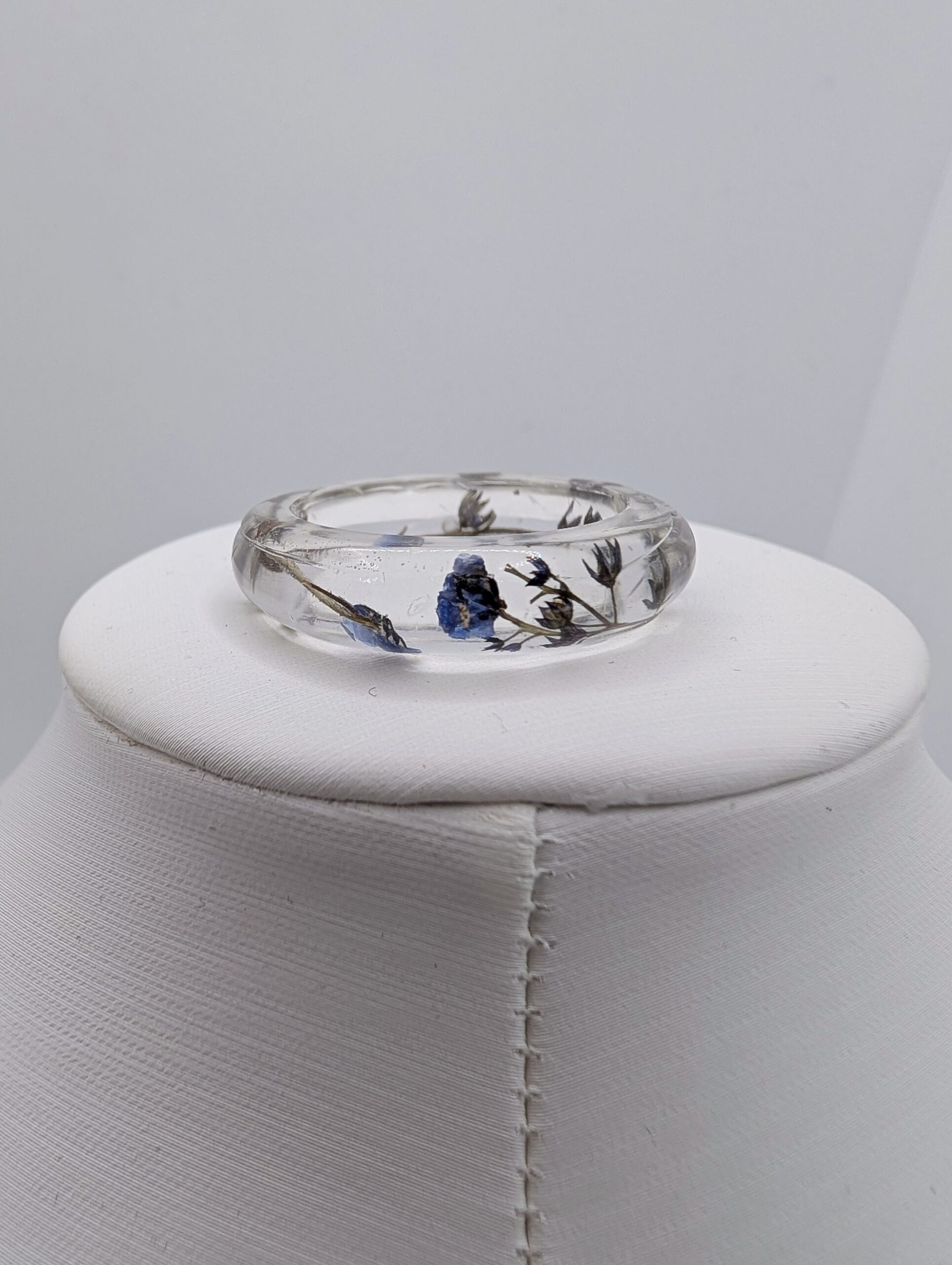 Ten ręcznie wykonany pierścionek z żywicy to pochwała prostoty oraz naturalnego piękna. Całość została odlana z krystalicznej masy, w której zatopiłam drobne, błękitne kwiaty niezapominajki. Ponieważ obrączka jest w pełni transparentna, rośliny wyglądają tak, jakby unosiły się w powietrzu wokół Twojego palca. W rezultacie otrzymujesz biżuterię niezwykle lekką, a zarazem bardzo efektowną. Dzięki temu ten dodatek idealnie pasuje do zwiewnych, letnich stylizacji oraz codziennych zestawów.