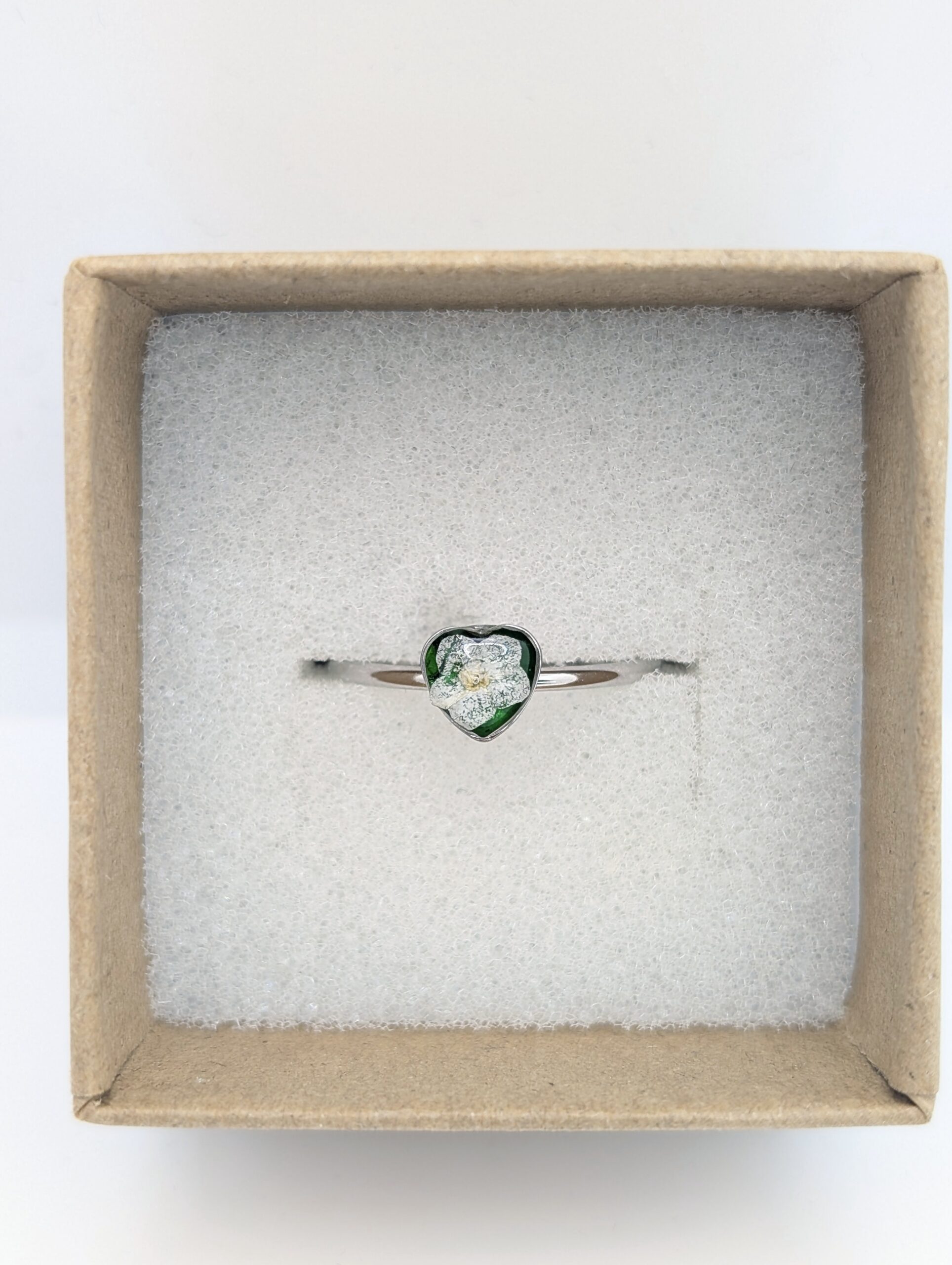 Ten ręcznie wykonany pierścionek z kwiatami to najbardziej romantyczny akcent w całej serii Szmaragdowa Głębia. W krystalicznie czystej żywicy zamknęłam delikatną białą niezapominajkę, którą oprawiłam w subtelną bazę w kształcie serca. Nasycona, butelkowa zieleń tła tworzy niesamowity kontrast z jasnymi płatkami, co przywodzi na myśl świeżość mchu ukrytego w cieniu drzew. Ponieważ niezapominajka jest symbolem szczerych uczuć, biżuteria ta niesie ze sobą spokój i dobrą energię. Co więcej, chłodny blask srebrnej oprawy idealnie wydobywa głębię koloru, tworząc dodatek, który zachwyca swoją lekkością.