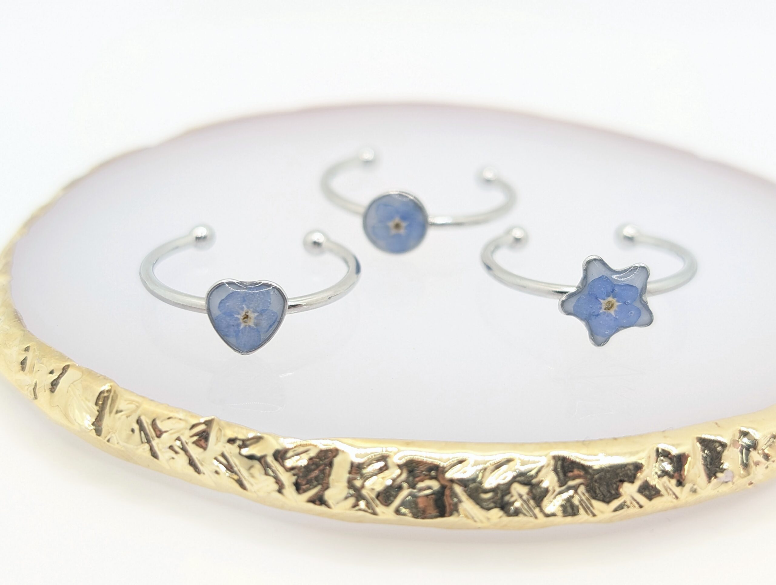 Materiał: stal szlachetna (kolor srebrny), żywica, suszona niezapominajka.
