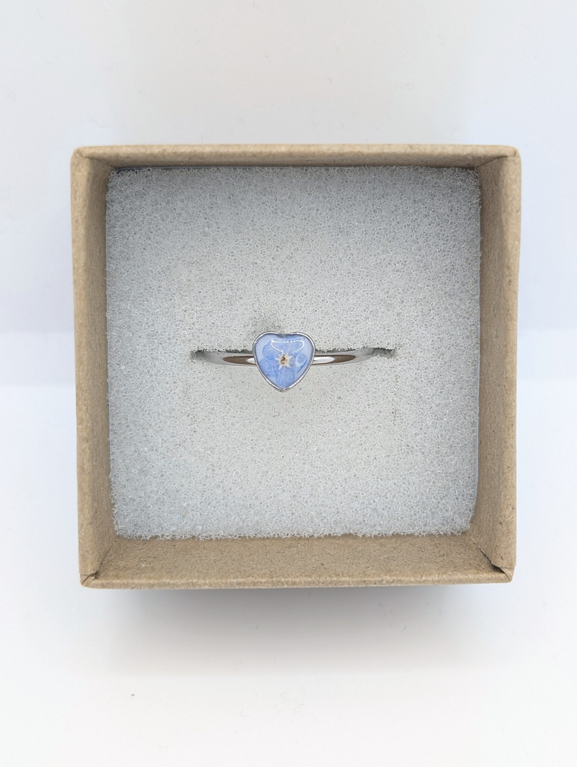 Ten ręcznie wykonany przedmiot stanowi idealne połączenie klasycznego symbolu serca z botaniczną delikatnością. W srebrzystej oprawie o gładkich krawędziach zamknęłam autentyczną niebieską niezapominajkę, którą wyeksponowałam na jasnym, czystym tle. Ponadto przejrzysta masa krystaliczna pięknie załamuje światło, dlatego kwiatek wydaje się niemal żywy i nasycony błękitem. Ponieważ serce kojarzy się z głębokimi uczuciami, ten pierścionek z żywicy emanuje bardzo ciepłą oraz pozytywną energią. W rezultacie stworzyłam dodatek, który przyciąga wzrok i świetnie uzupełni każdą stylizację.