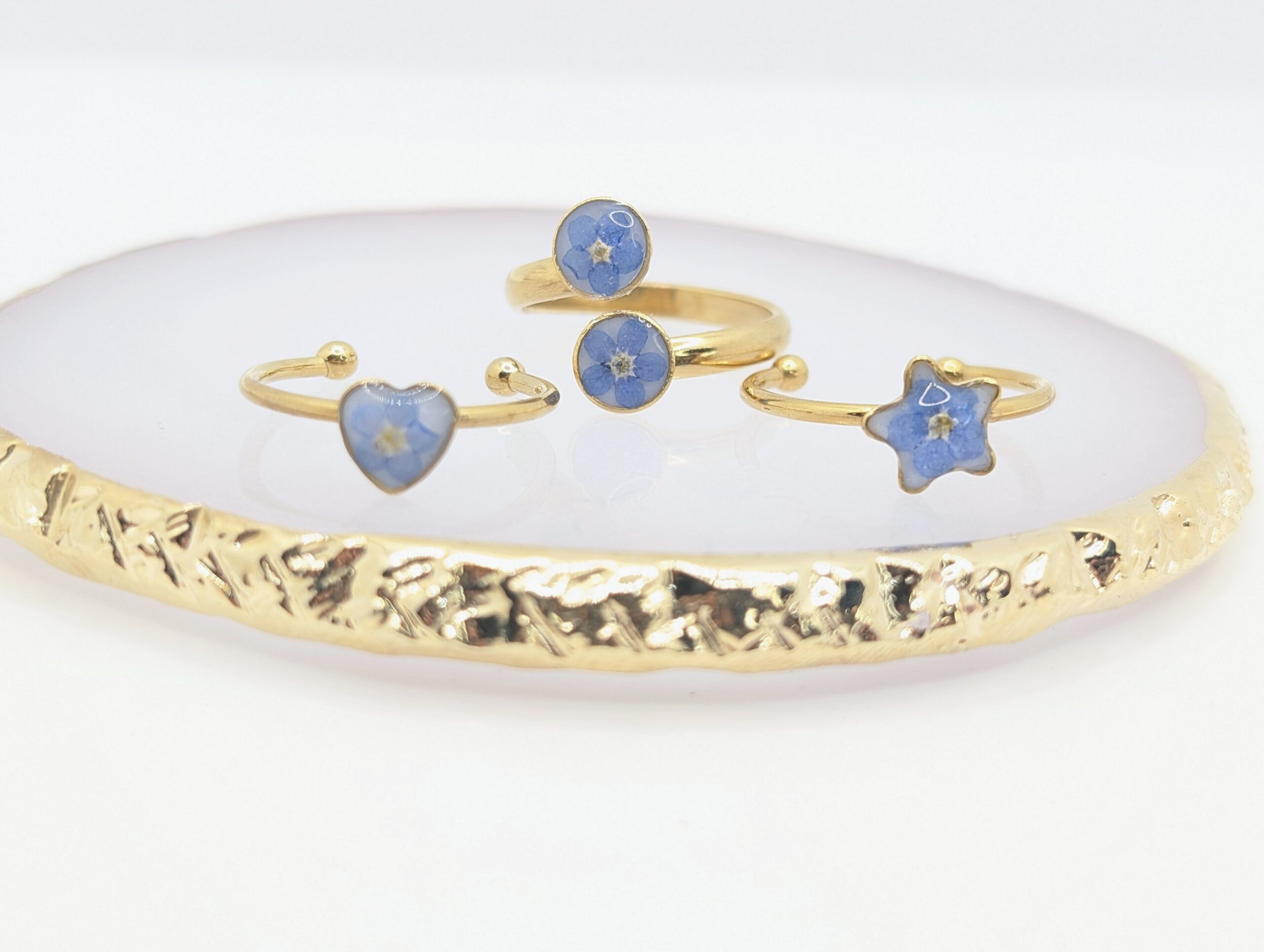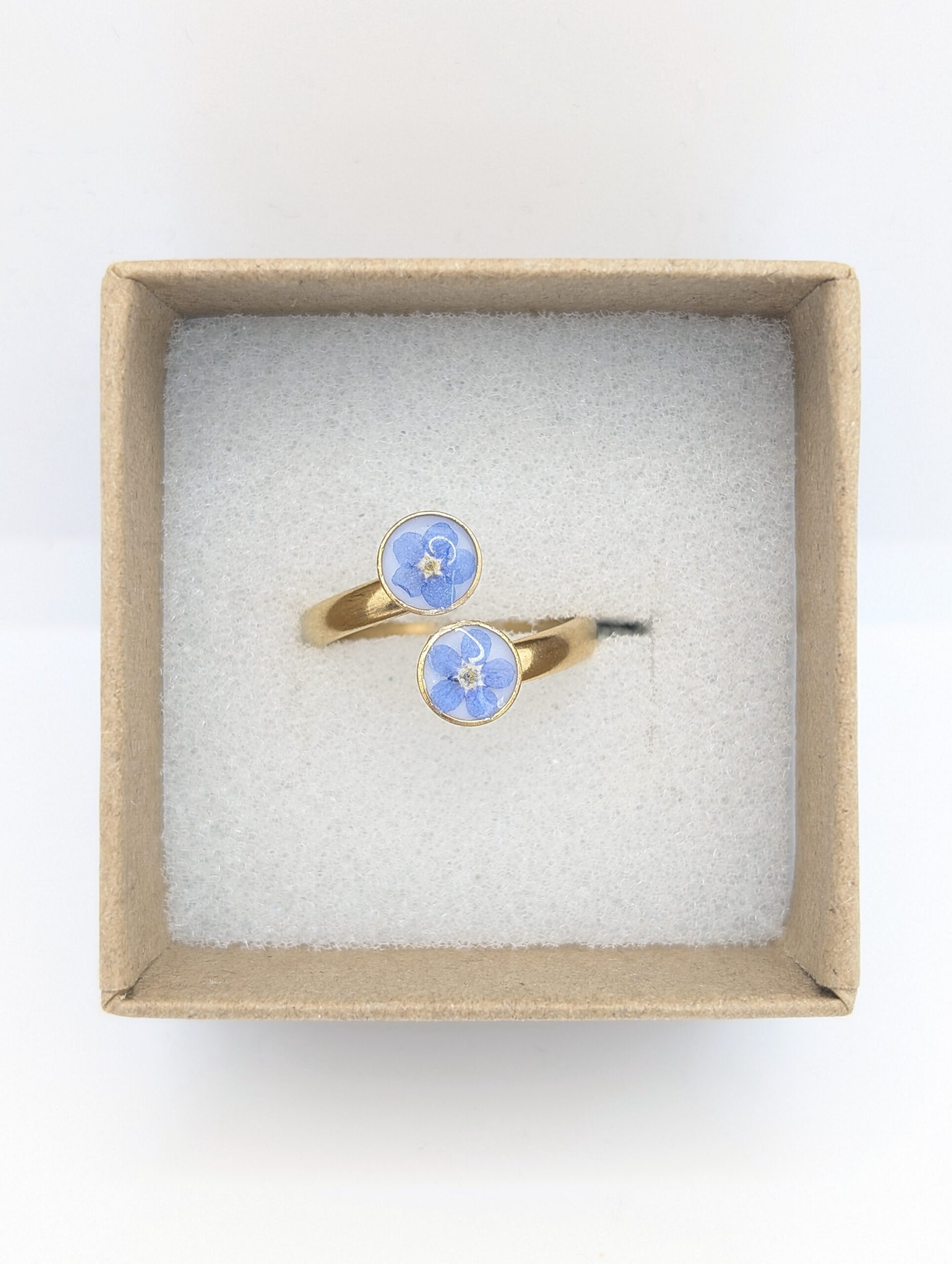 Przygotowanie biżuterii z tak drobnymi elementami to proces, który wymaga ode mnie szczególnej uważności w mojej pracowni. Każdy błękitny kwiatek muszę ułożyć tak, aby jego delikatna struktura była w pełni widoczna pod idealnie gładką powierzchnią żywicy. Dzięki temu masz pewność, że otrzymujesz produkt unikatowy, który wykonałam własnoręcznie od podstaw, dbając o najwyższą jakość wykończenia. Wykorzystana pozłacana stal szlachetna jest materiałem hypoalergicznym i niezwykle trwałym, dlatego pierścionek zachowuje swój blask przez długie lata. Wybierając moje prace, wspierasz autentyczne polskie rzemiosło i pasję do tworzenia rzeczy wyjątkowych.