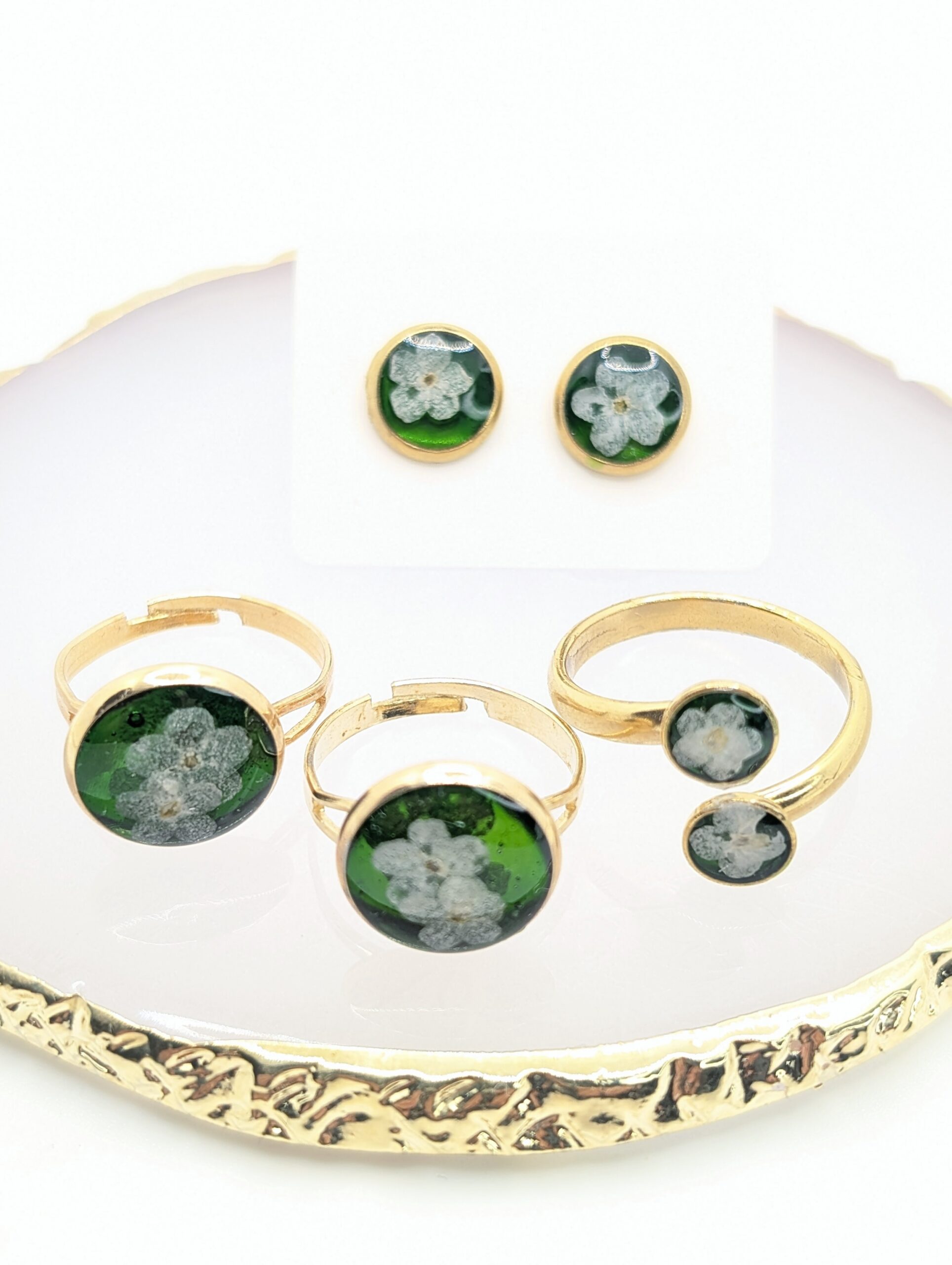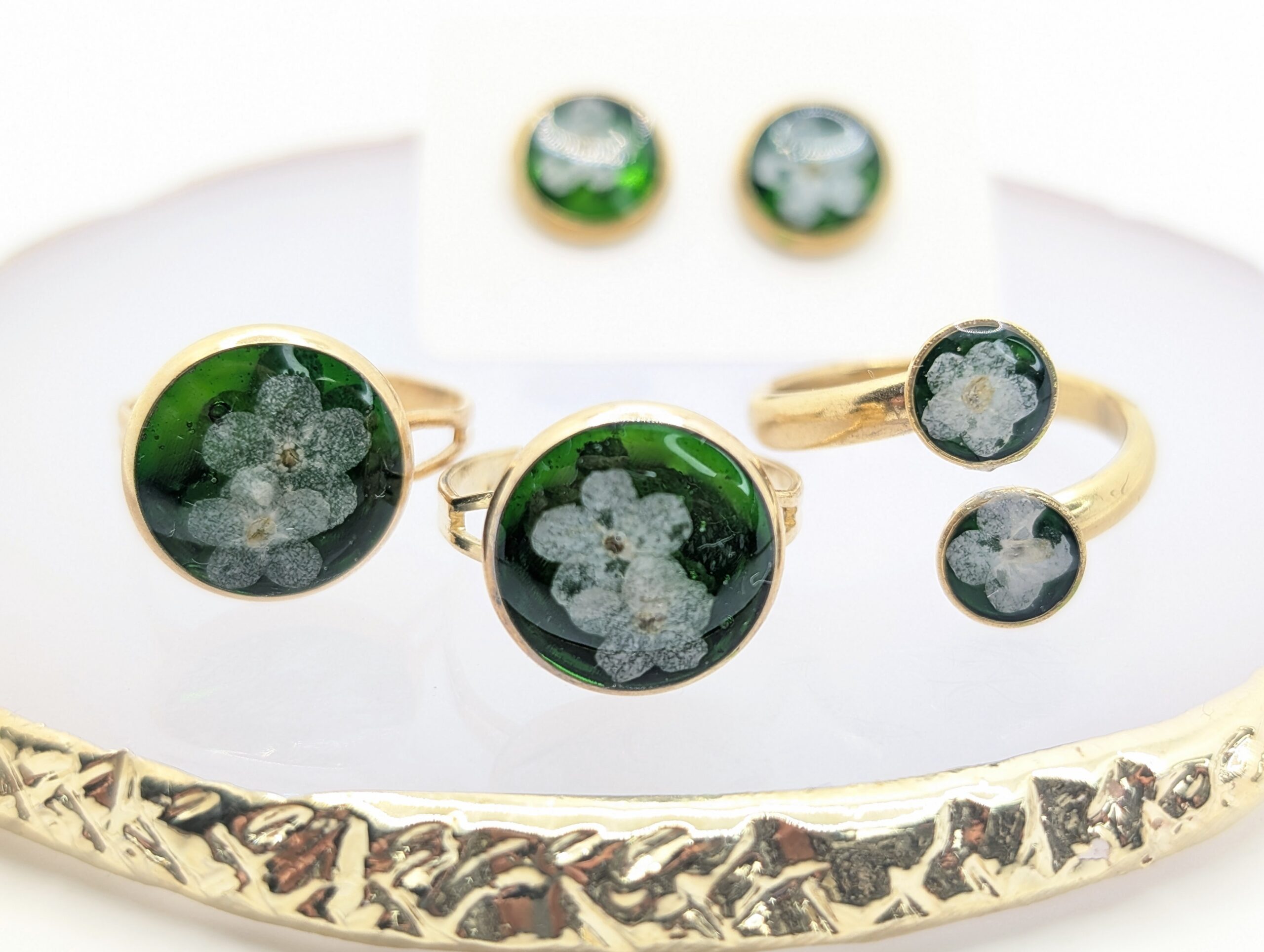 Ten ręcznie wykonany pierścionek z żywicy to propozycja dla osób, które kochają subtelność i biżuteryjny detal. Choć oczka są mniejsze niż w moich poprzednich projektach, to właśnie w nich ukryłam prawdziwą magię natury. W krystalicznej tafli zamknęłam miniaturowe białe niezapominajki, które wyeksponowałam na tle nasyconej, butelkowej zieleni. Ta kompozycja z serii Szmaragdowa Głębia kojarzy się ze spokojem leśnej gęstwiny oraz świeżością mchu, dlatego pierścionek ten emanuje uspokajającą energią. Ponieważ te drobne kwiaty symbolizują szczere uczucia i pamięć, jest to biżuteria o wyjątkowo osobistym charakterze.