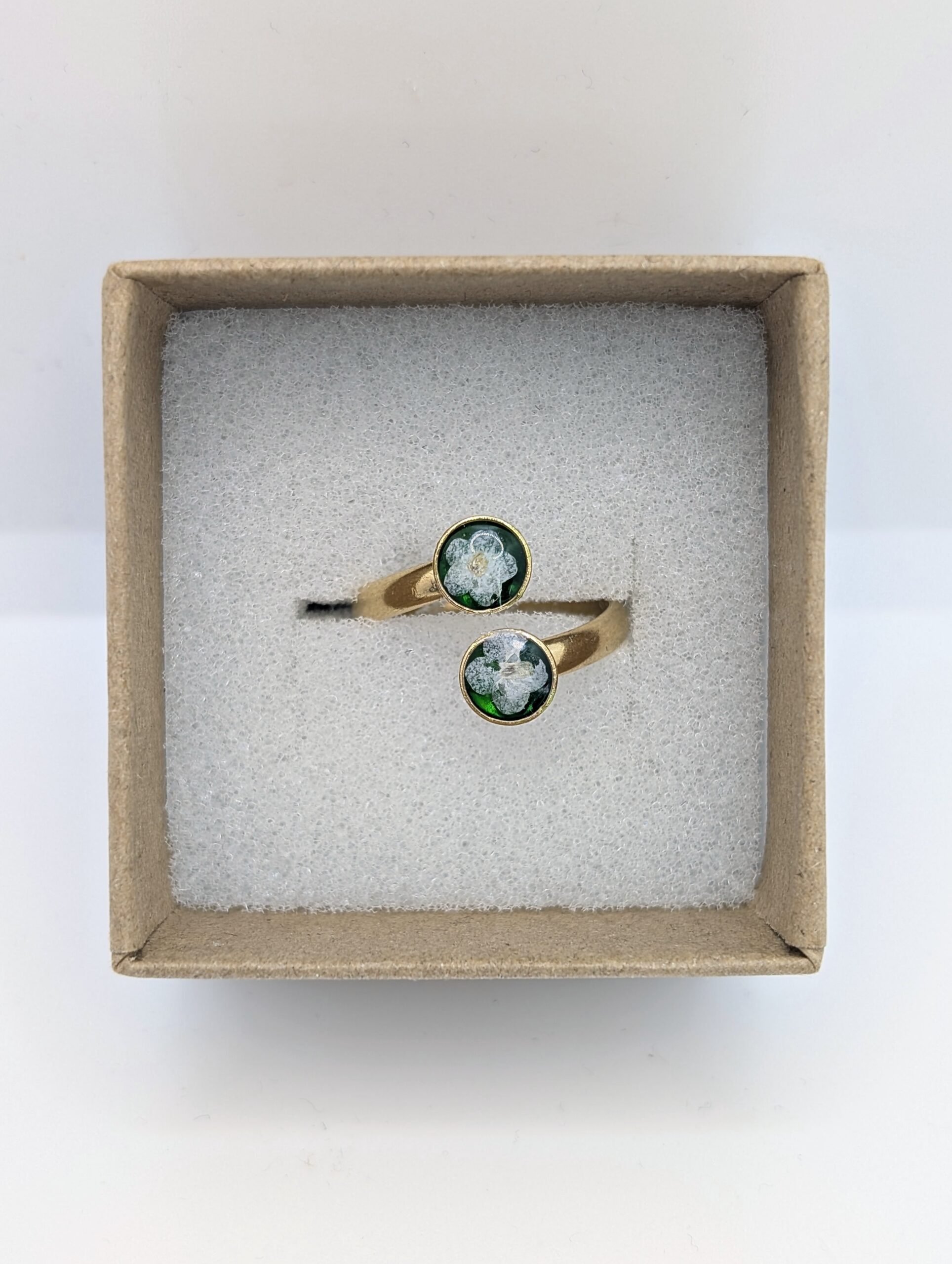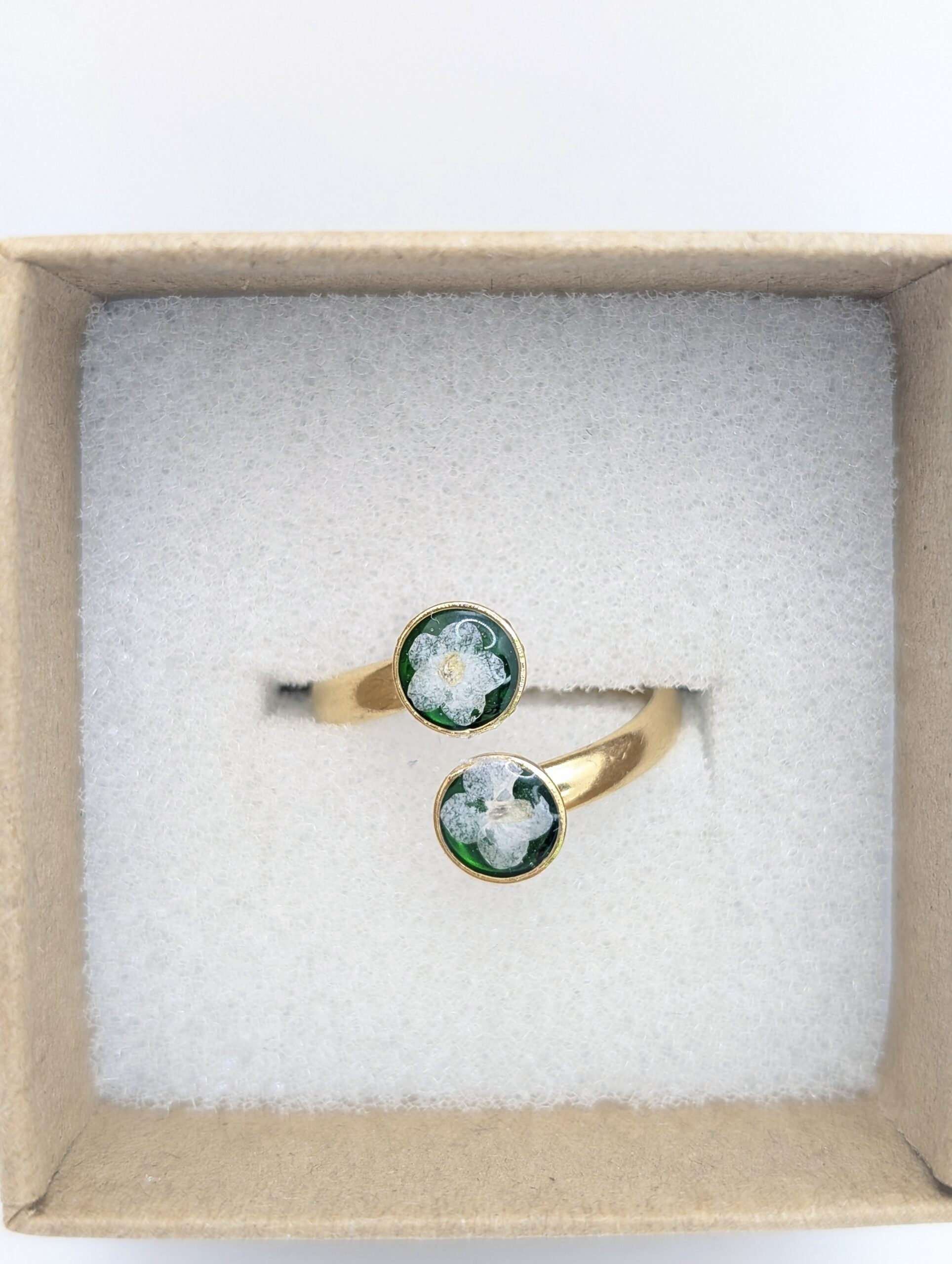 Tworzenie tak drobnych elementów to proces pełen pasji, ponieważ każdy kwiatek muszę ułożyć z milimetrową precyzją wewnątrz dwóch małych oczek. Z tego powodu poświęcam sporo czasu na dopracowanie detali, aby żywica była idealnie gładka i przejrzysta. Dzięki temu otrzymujesz produkt najwyższej jakości, który wykonałam własnoręcznie od podstaw w mojej pracowni. Ponadto wykorzystuję wyłącznie bezpieczne materiały, dlatego ten pierścionek z żywicy nie wywołuje alergii i zachowuje swój blask przez długie lata. Wybierając moje prace, wspierasz niezależną twórczość, co daje mi ogromną motywację do dalszego działania.